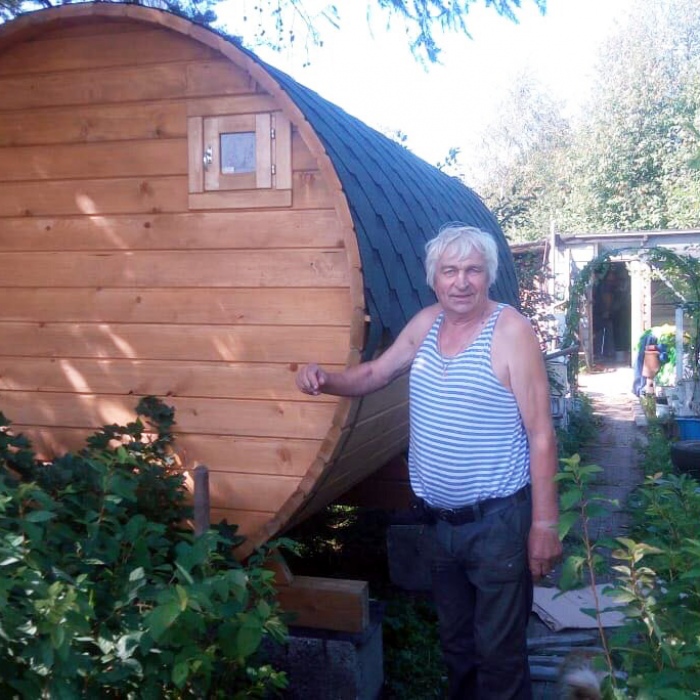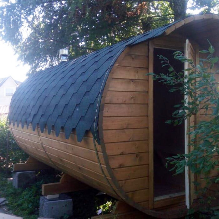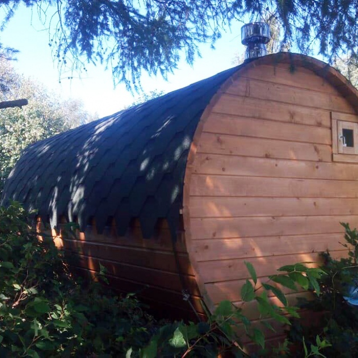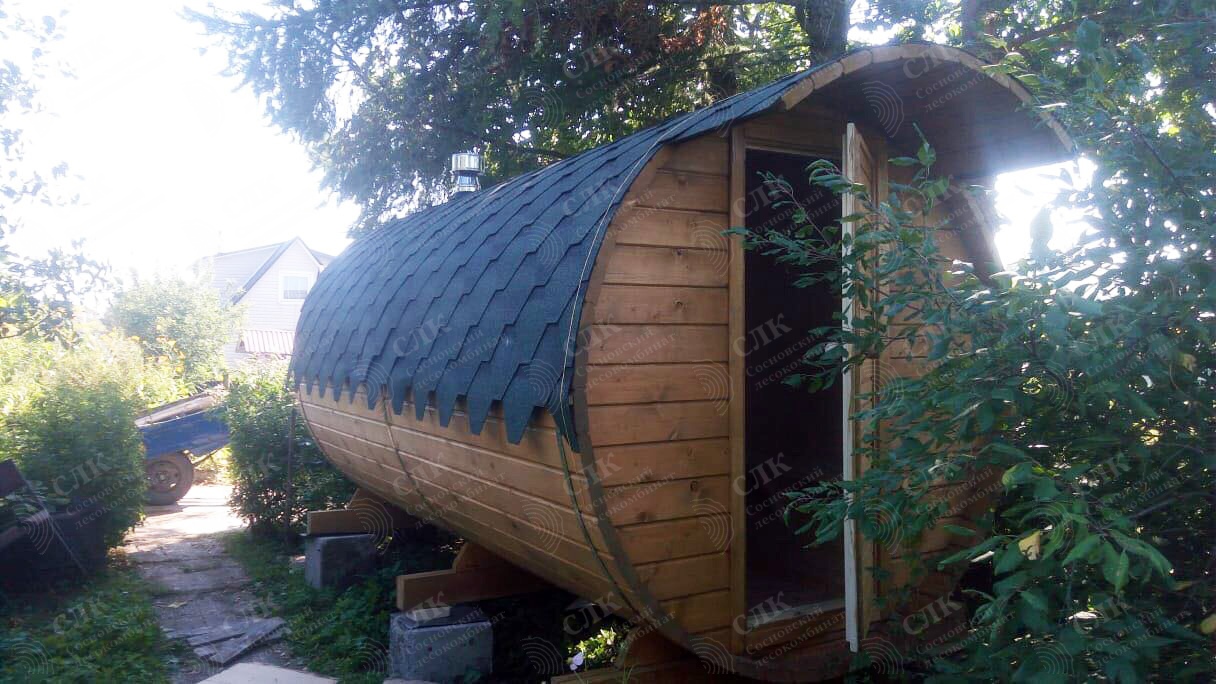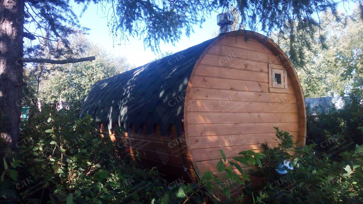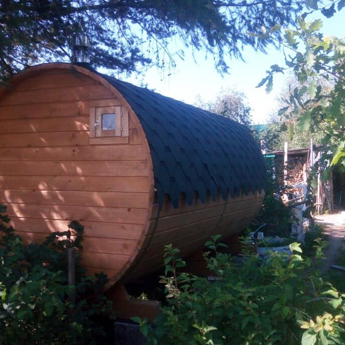 Баня-бочка длина 4,5 метров по козырьку, стандартная комплектация с увеличенным диаметром в 230 см. Доставка и установка на бетонный блок.