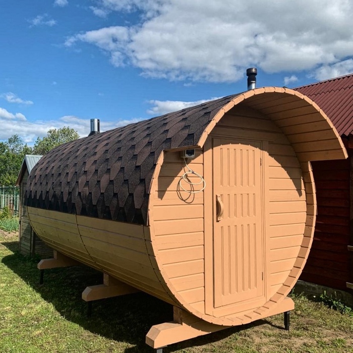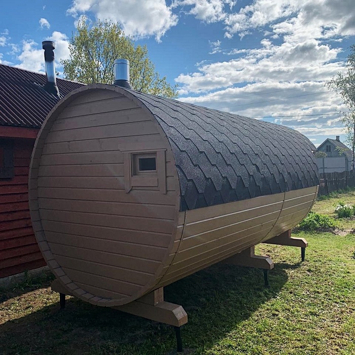 Баня-бочка длина 5 метров по козырьку, стандартная комплектация с увеличенным диаметром в 230 см. Доставка и установка на бетонный блок.