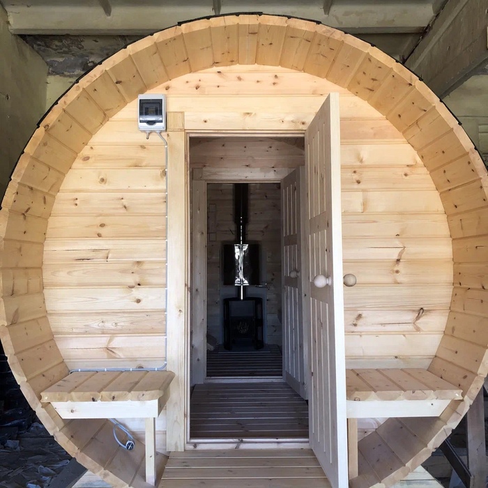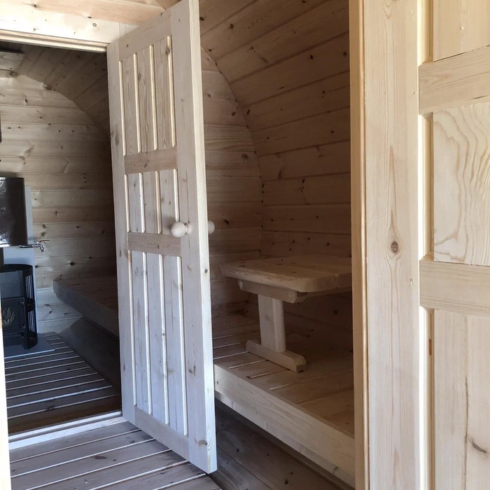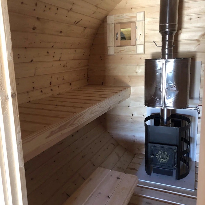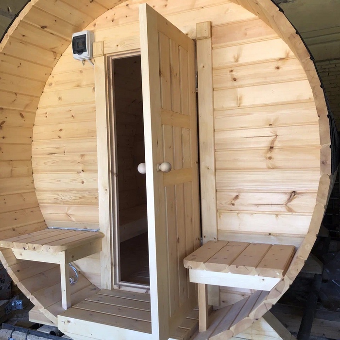 Баня-бочка длина 4,5 метров с крыльцом, диаметр 230 см, с небольшим столиком внутри. Доставка и установка на бетонный блок.