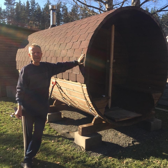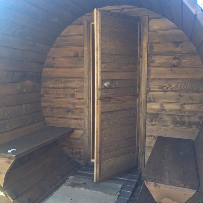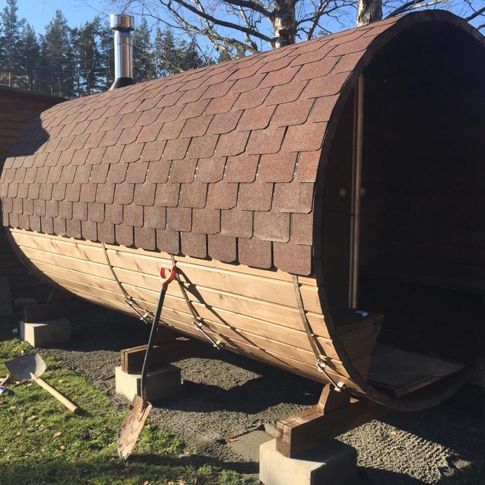 Баня-бочка длина 4 метра в длину, увеличенное крыльцо длиной 1 метр, стандартная комплектация, диаметр 230 см. Доставка и установка на бетонный блок.