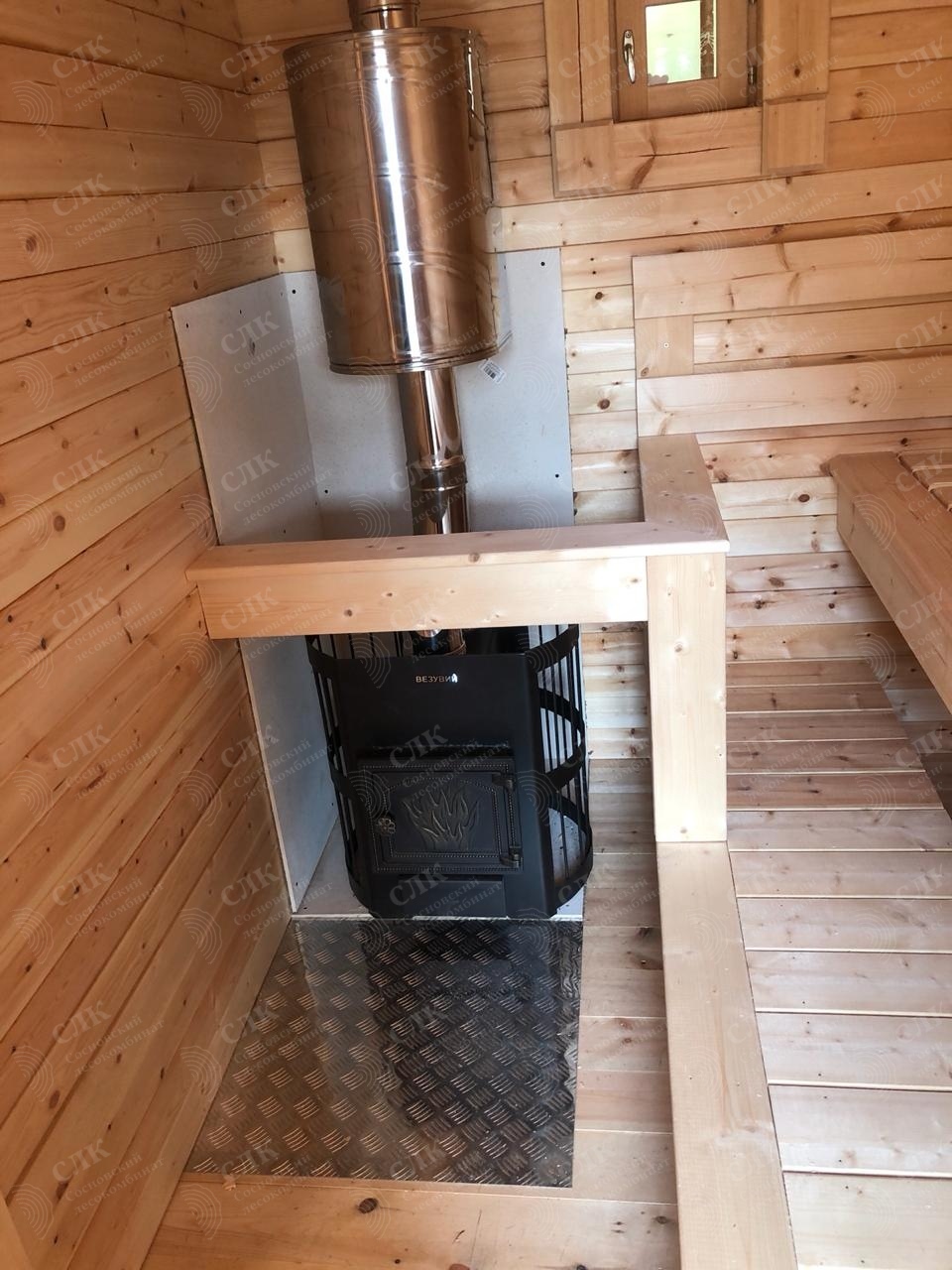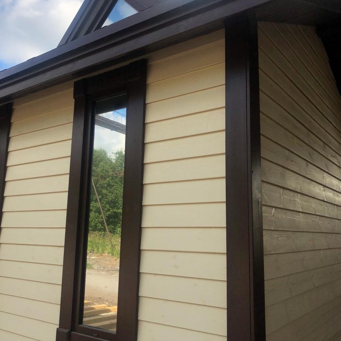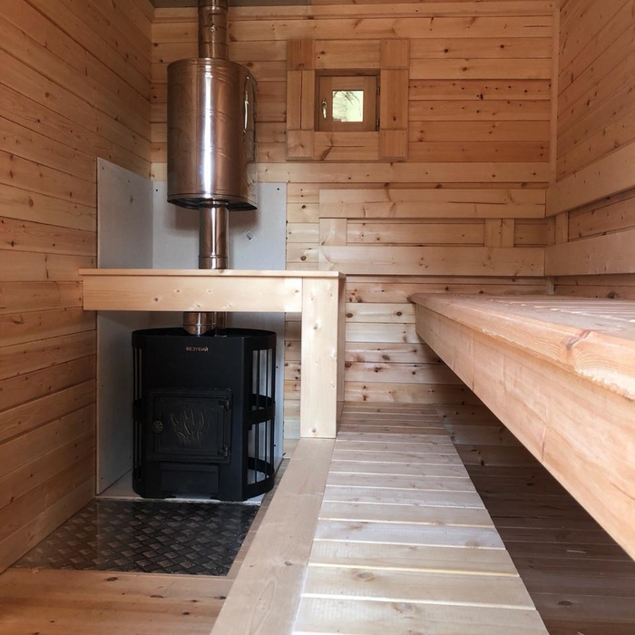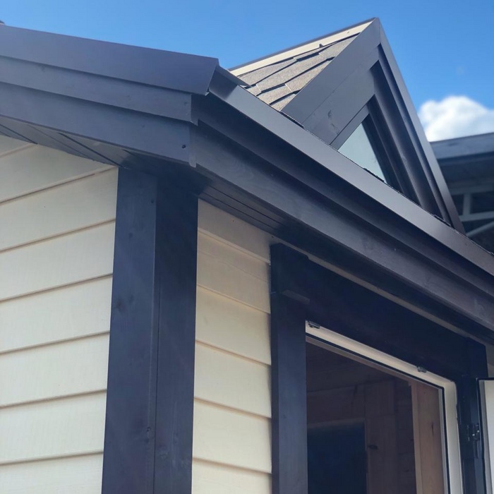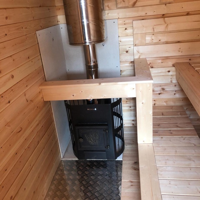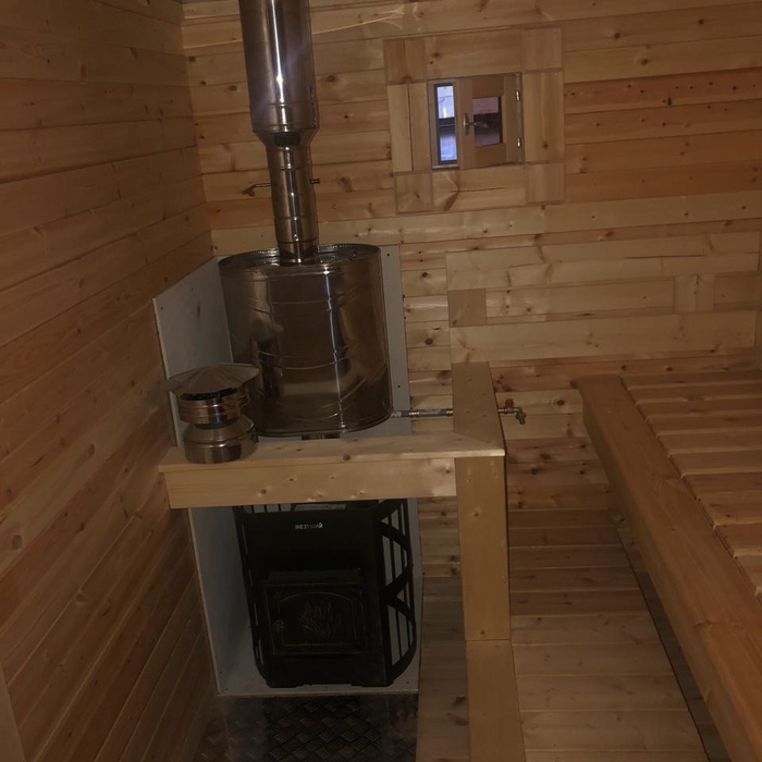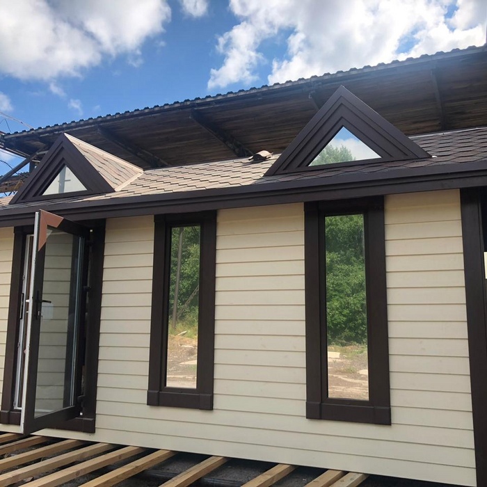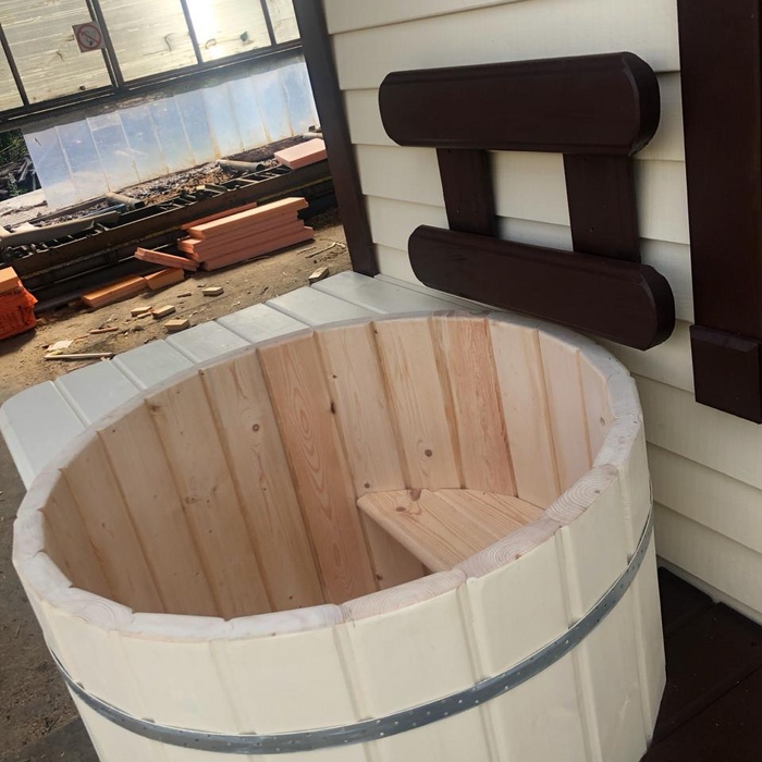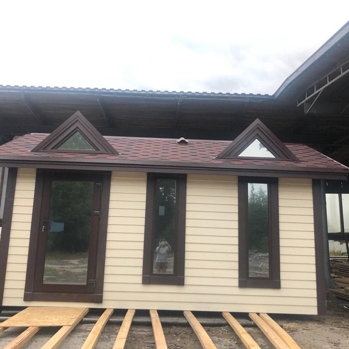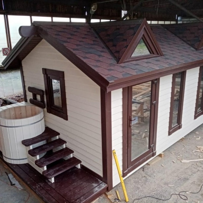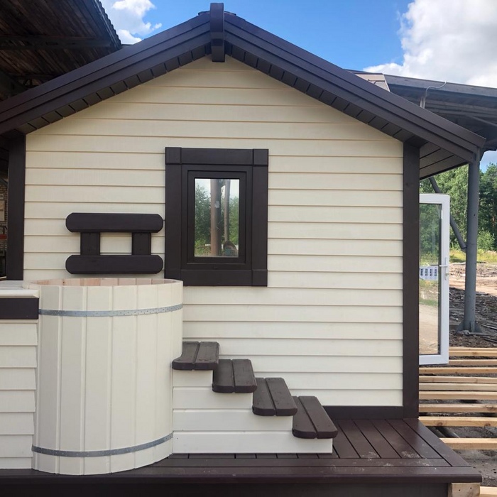 Каркасная мобильная баня Флора 6 метров в длину, 3,3 метра в ширину по свесам кровли, 2 секции. Дополнительно была установлена купель.