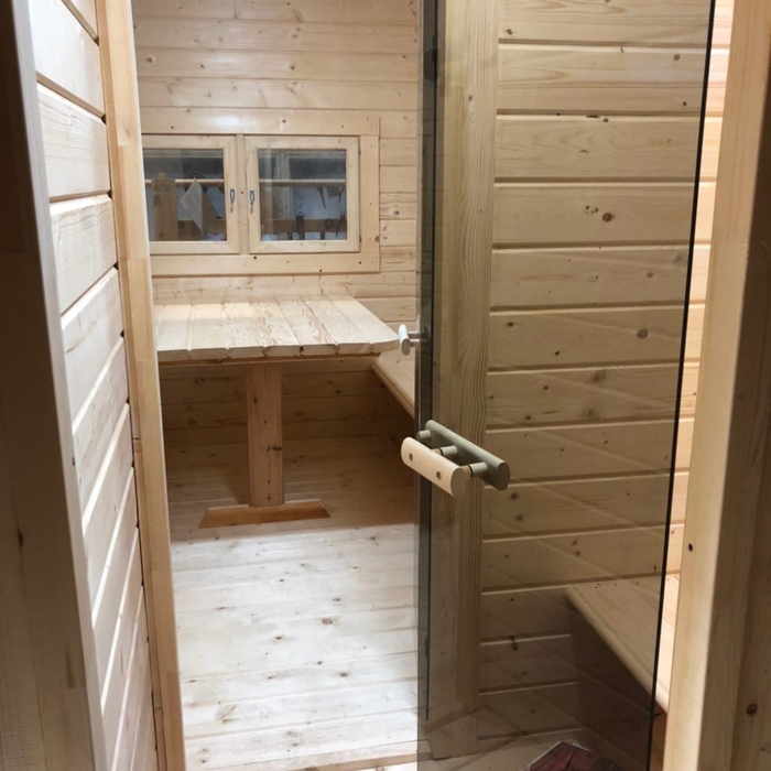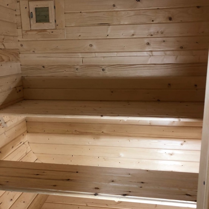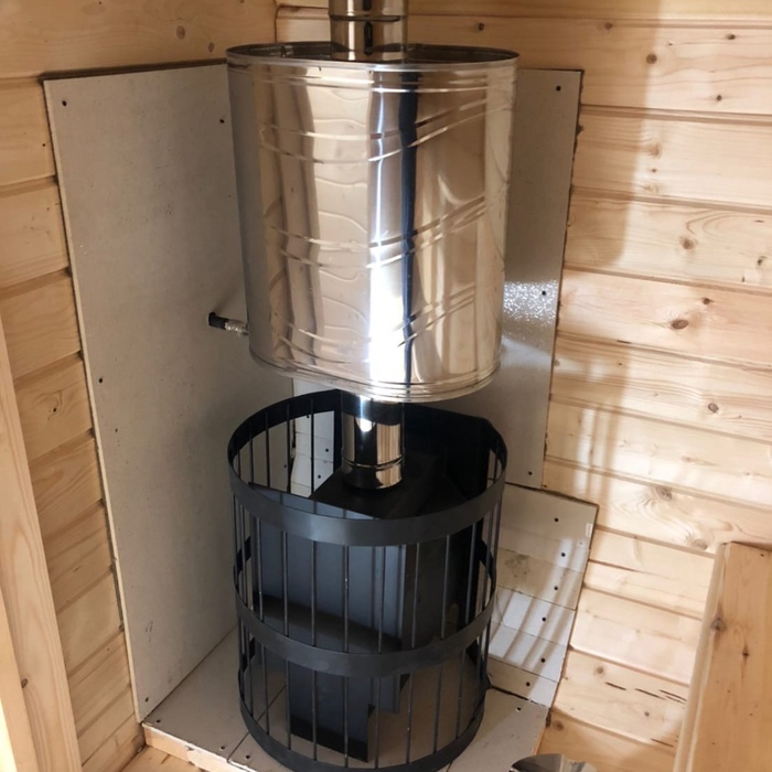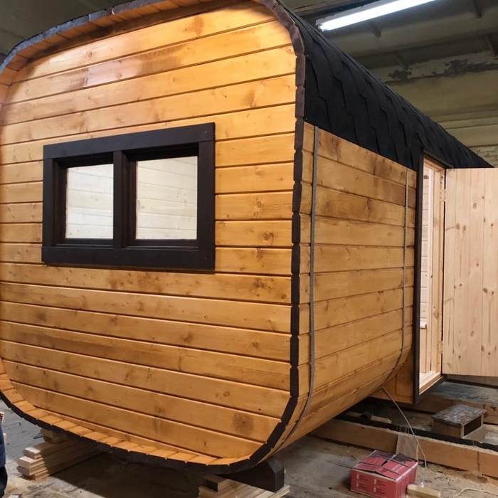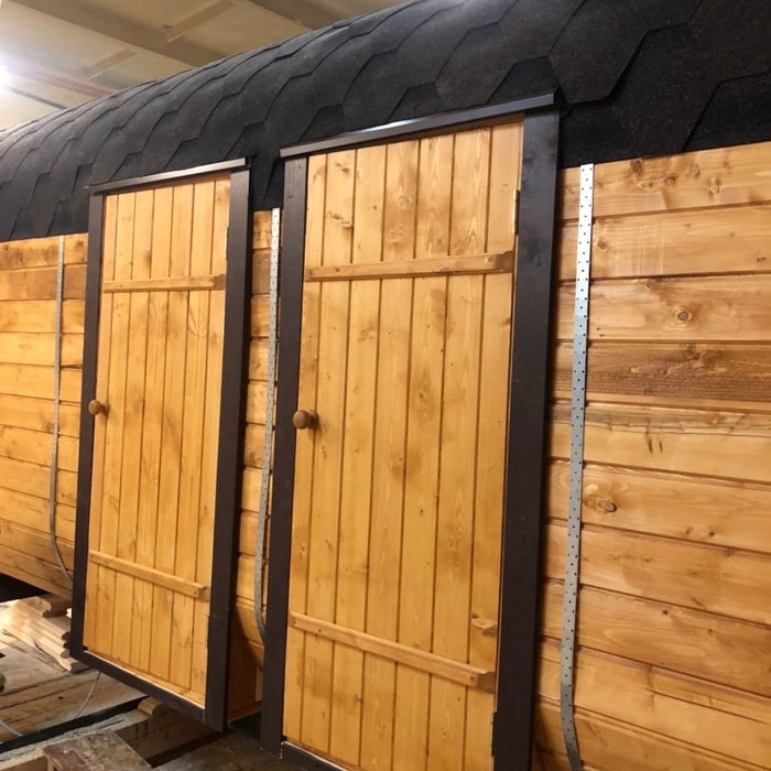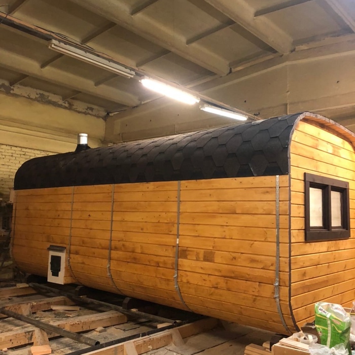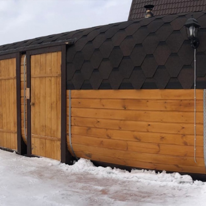 Квадро баня-бочка с боковым входом и сан. узлом с отдельным входом, длина 6 метров, увеличенная ширина и высота корпуса в 250 см. Доставка и установка на фундамент заказчика. Корпус покрыт антисептиком Тиккурила Valti 5059.
