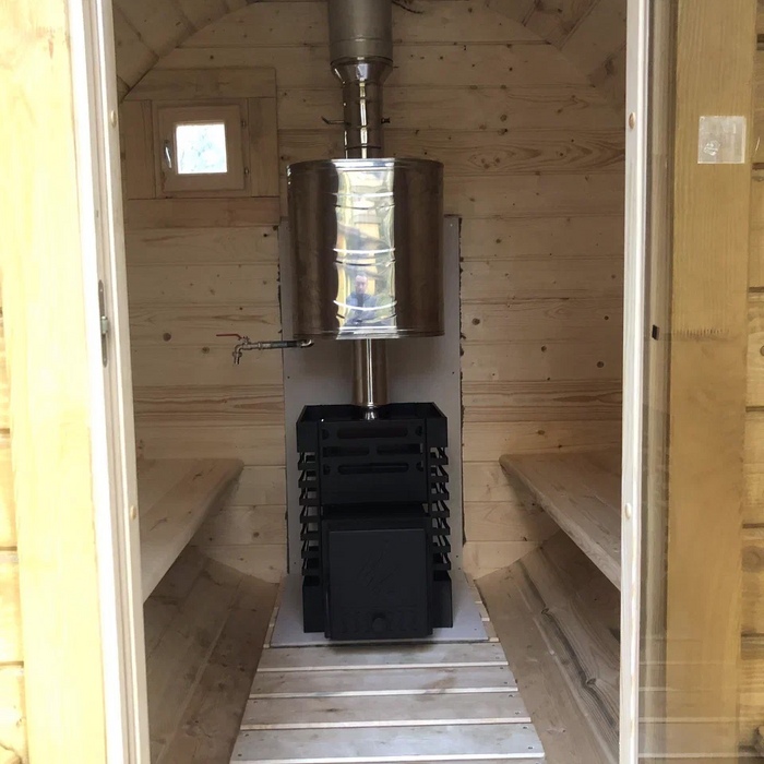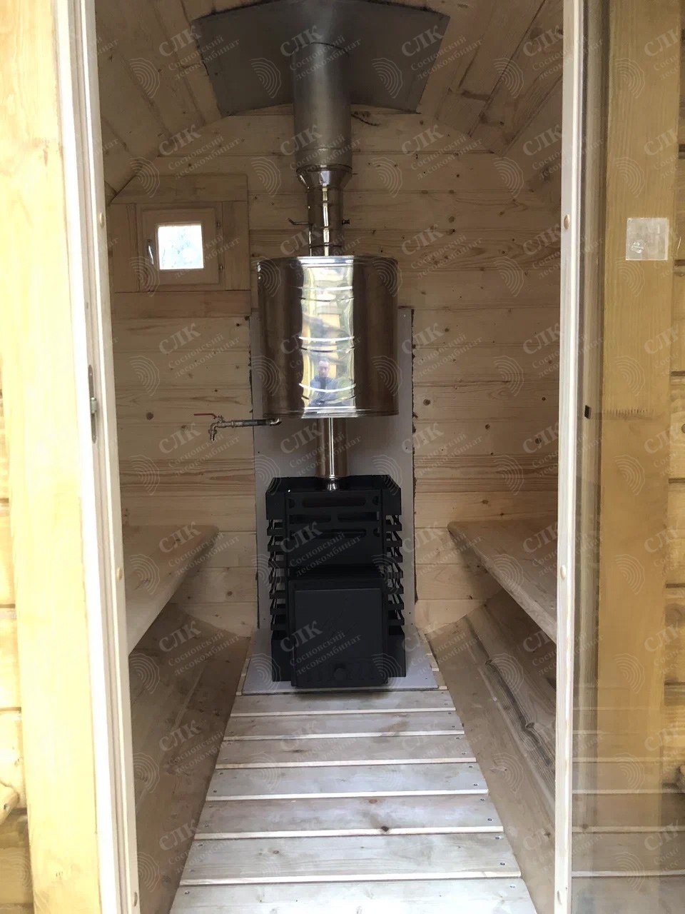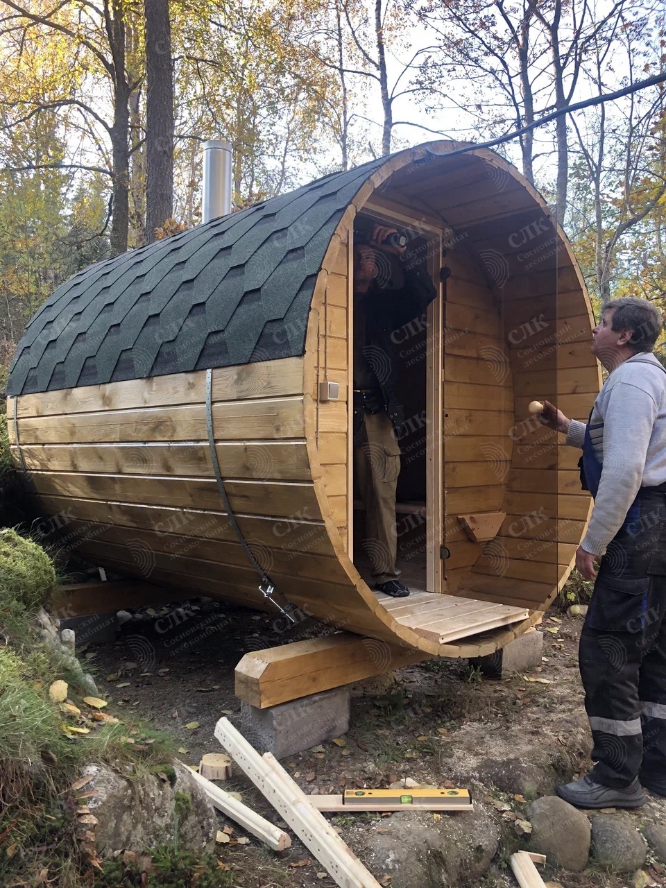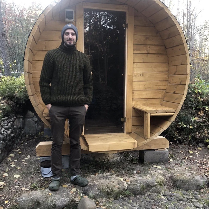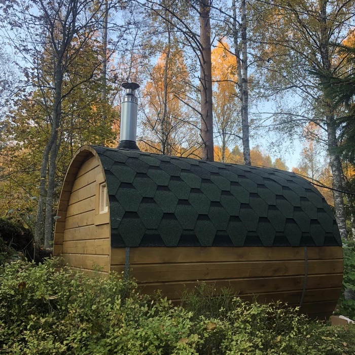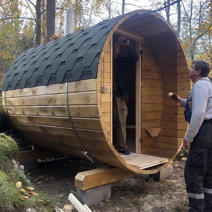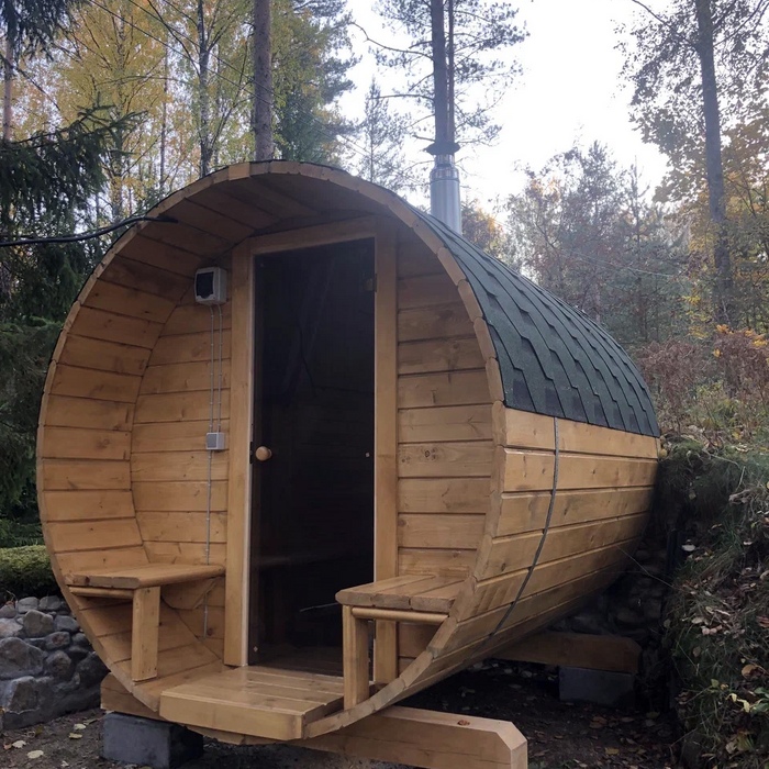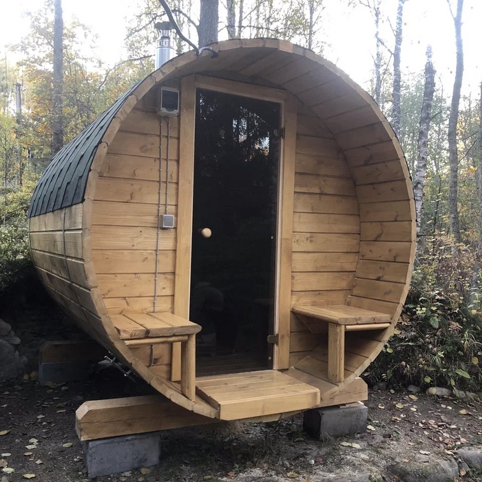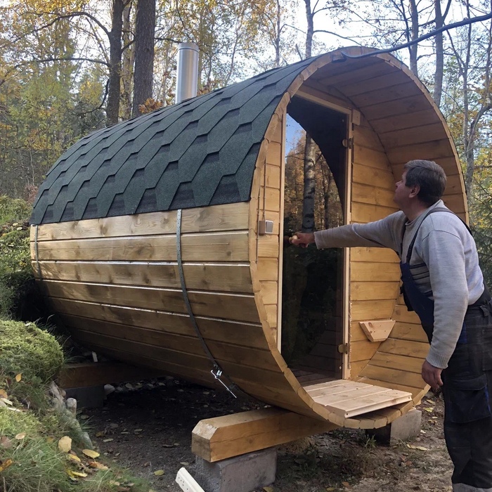 Малая баня-бочка на одно помещение - парная с совмещенной помывочной, длина 2,5 метров с крыльцом, диаметр 230 см. Доставка и установка на бетонный блок.