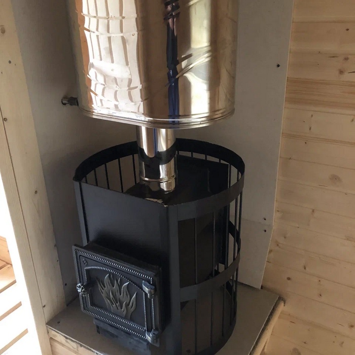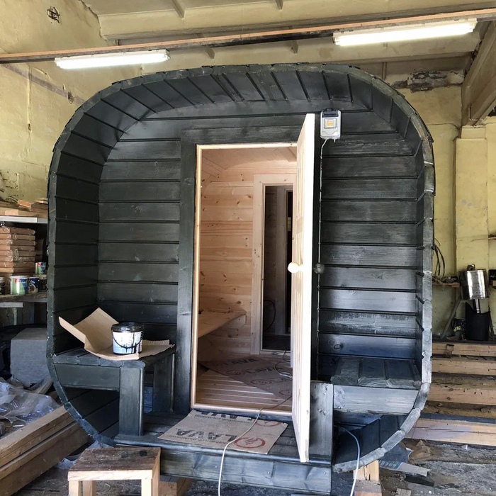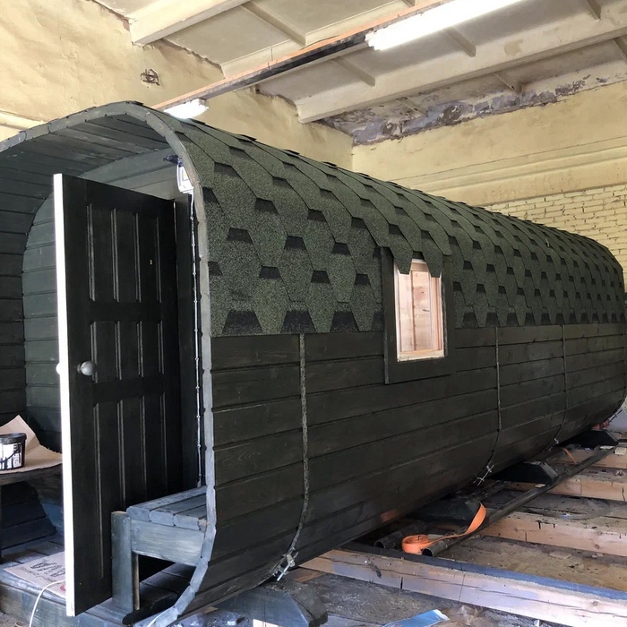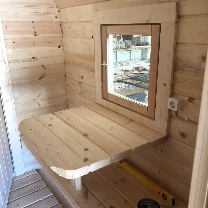 Квадро баня-бочка с крыльцом длина 6 метров, с дополнительным боковым окном 60x60 см и столом под ним, Г-образные пологи в парном отделении и печь в углу. Доставка и установка на бетонный блок.
