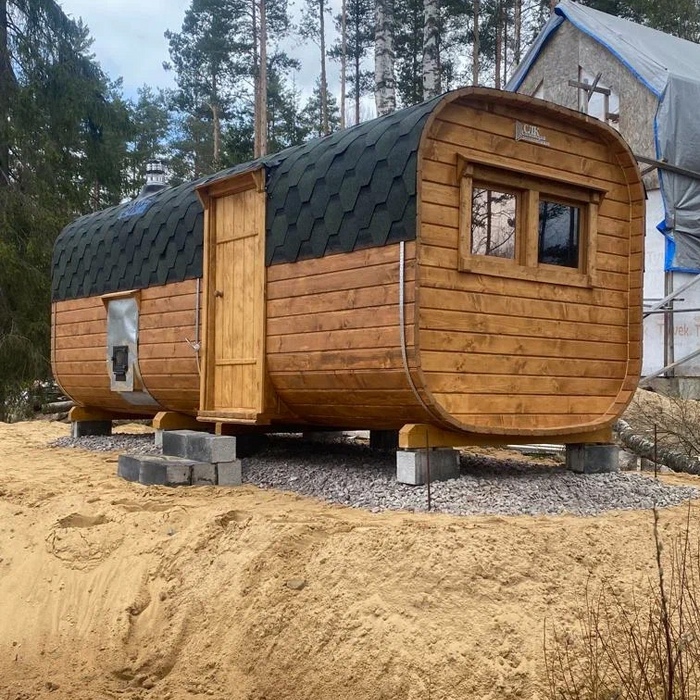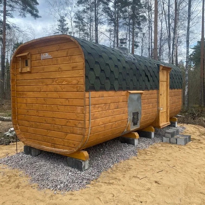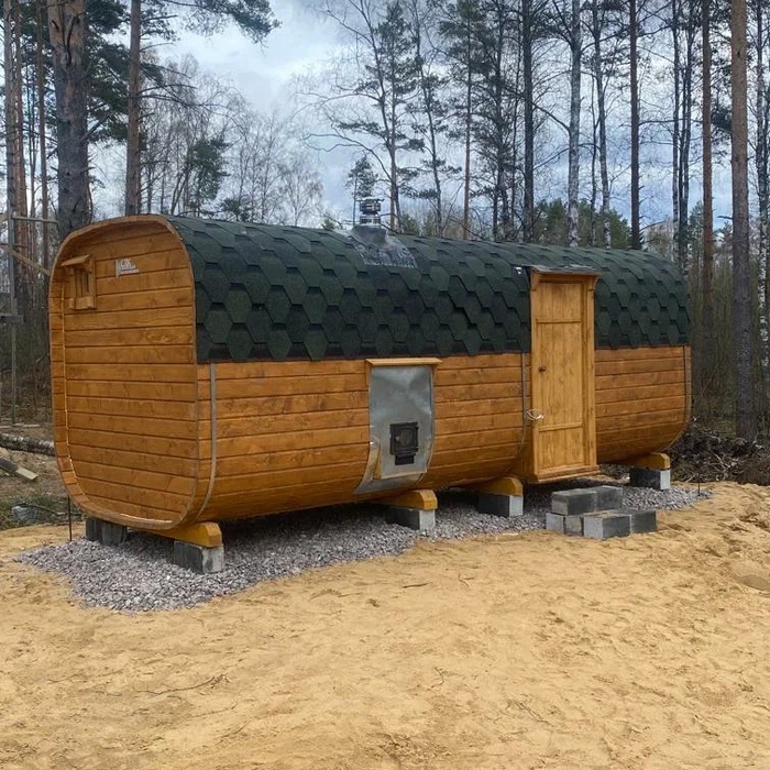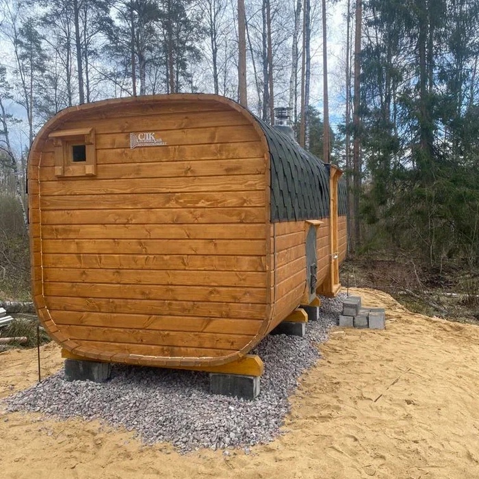 Баня квадро длина 6 метра с боковым входом и выносом топки на улицу. Оформили дополнительно небольшой козырек над входной дверью.