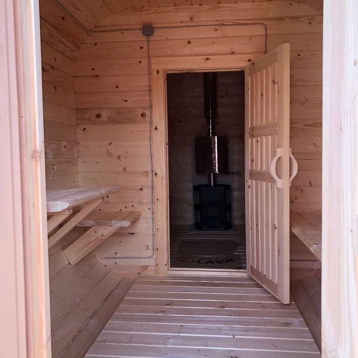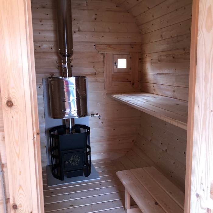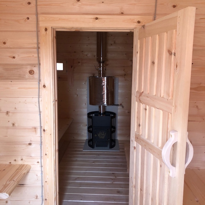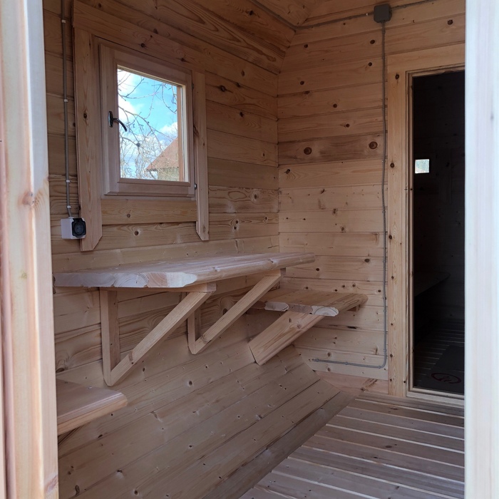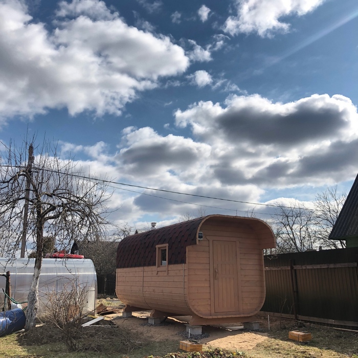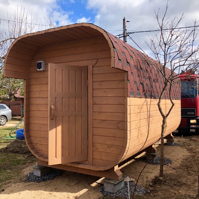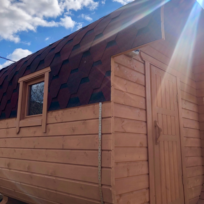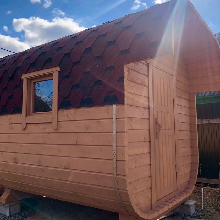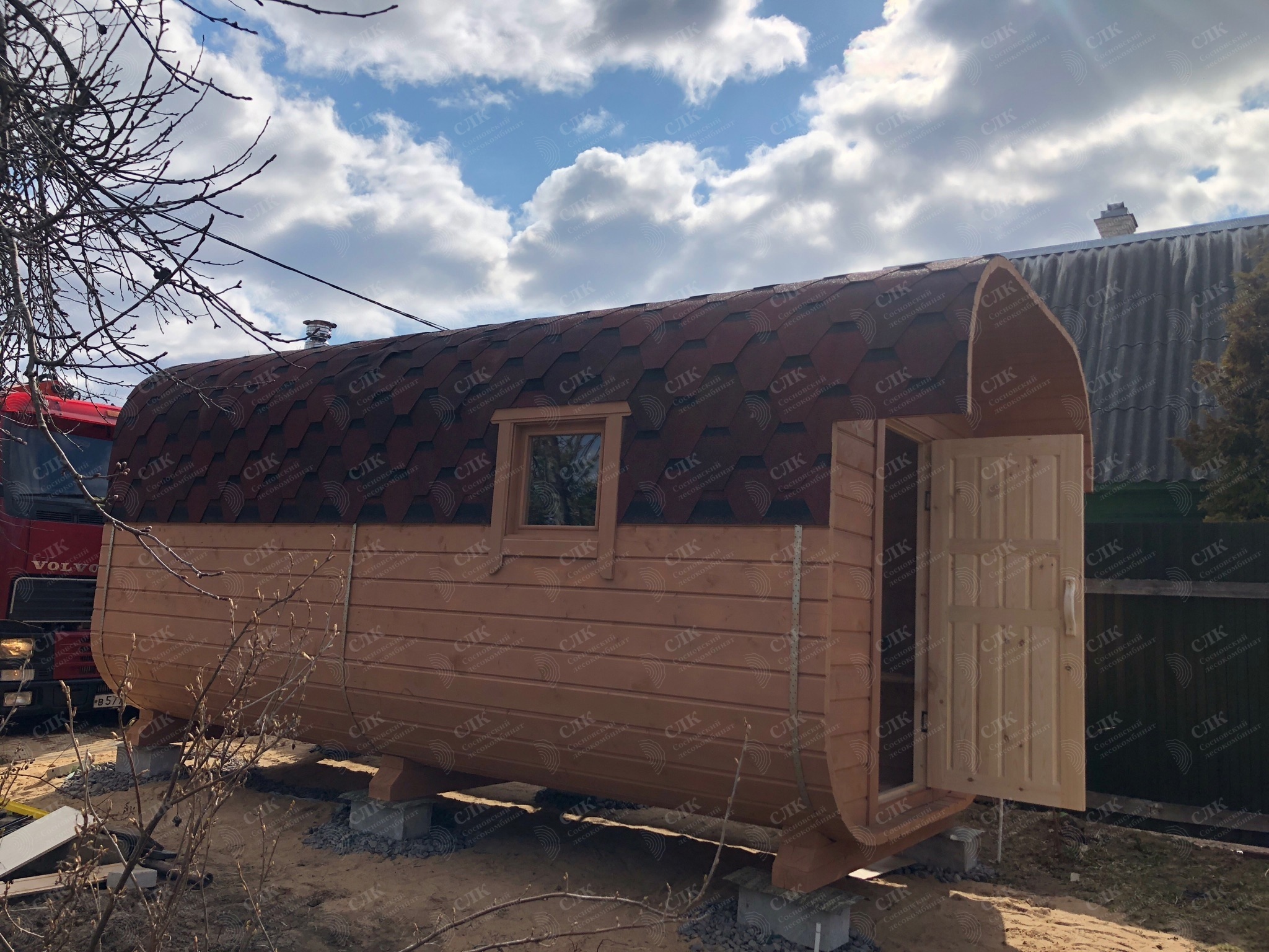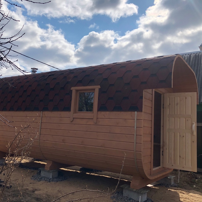 Квадро баня-бочка длина 5,5 метров по козырьку, ширина и высота корпуса 230 см с дополнительным окном 60x60 см и столом в предбаннике. Доставка и установка на фундамент заказчика.