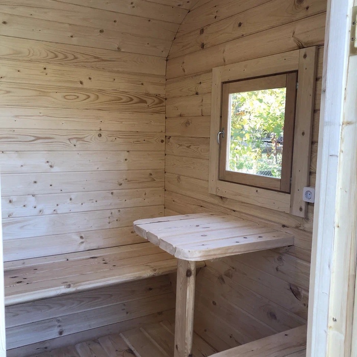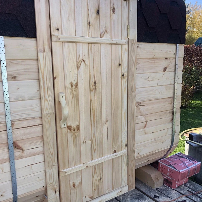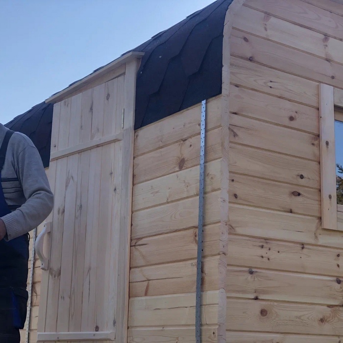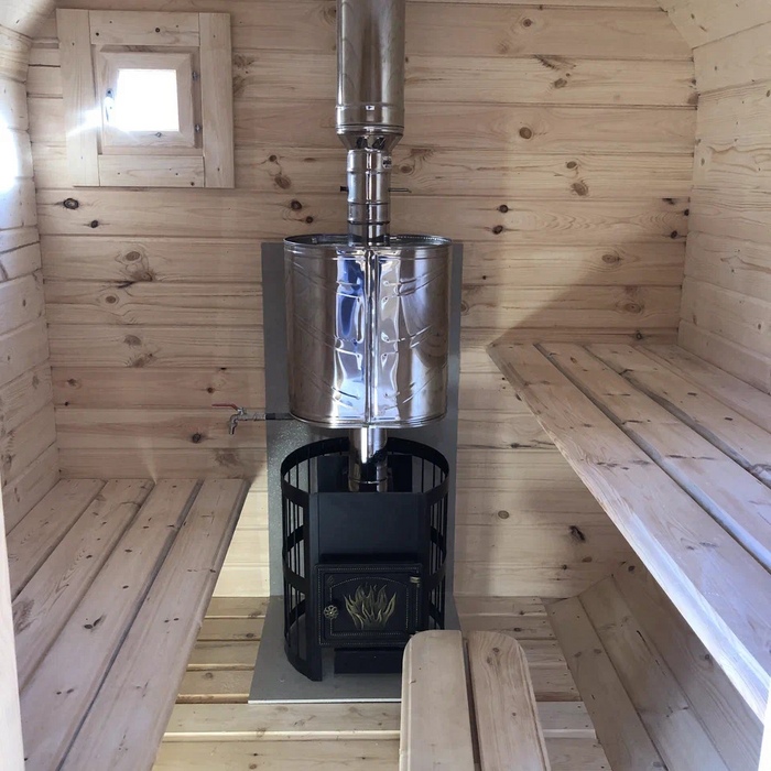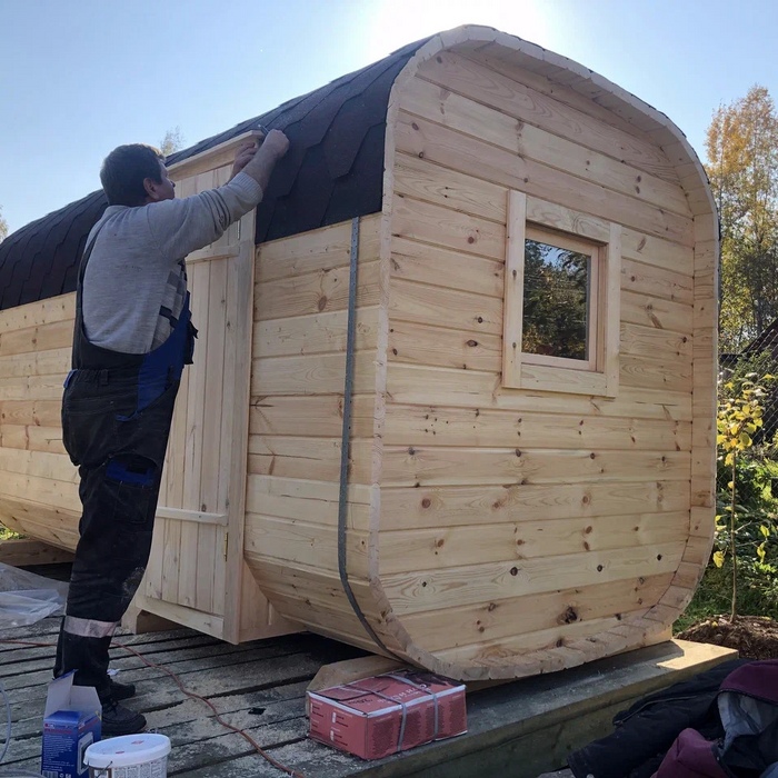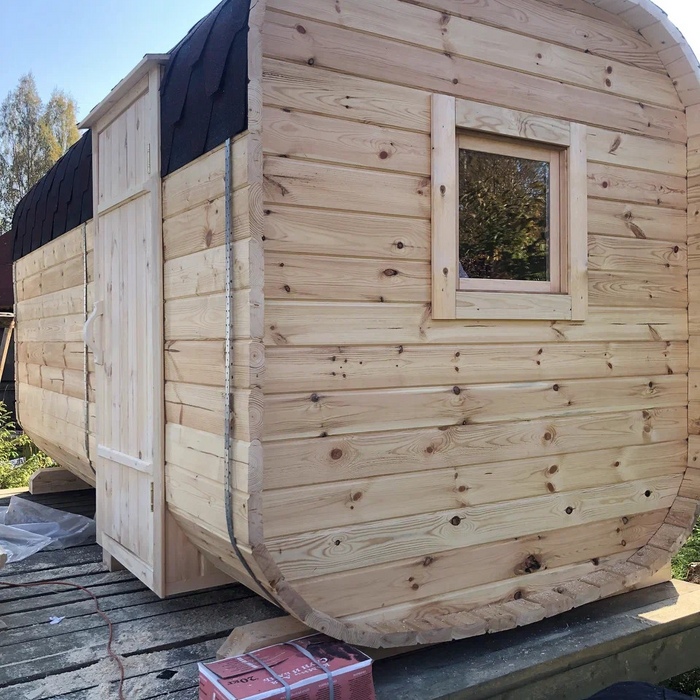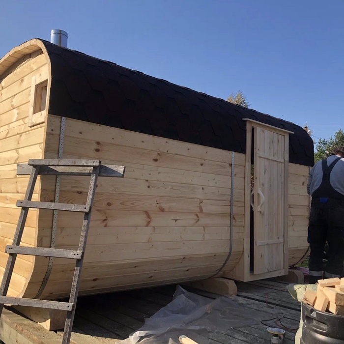 Квадро баня-бочка с боковым входом длина 4 метра, стандартная комплектация. Доставка и сборка на участке заказчика, установка на фундамент заказчика.