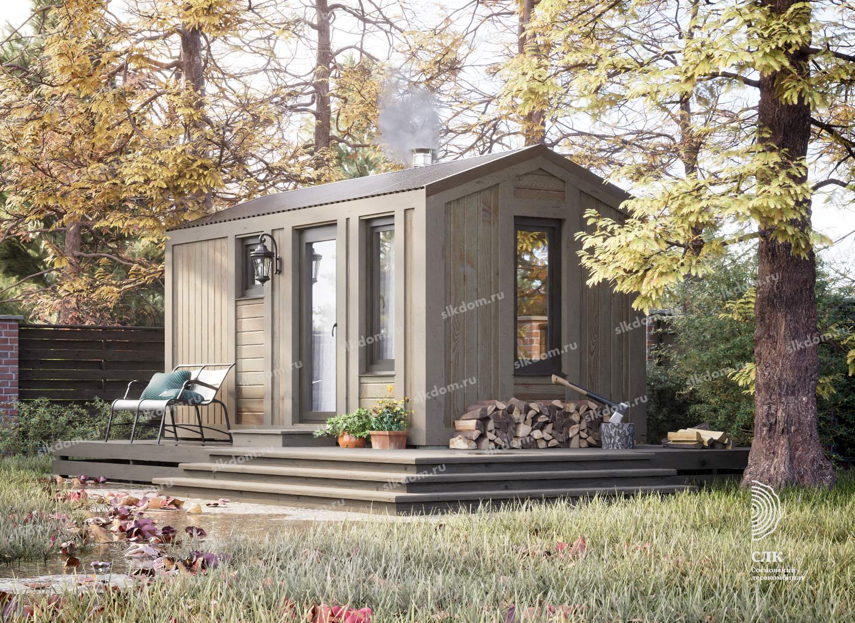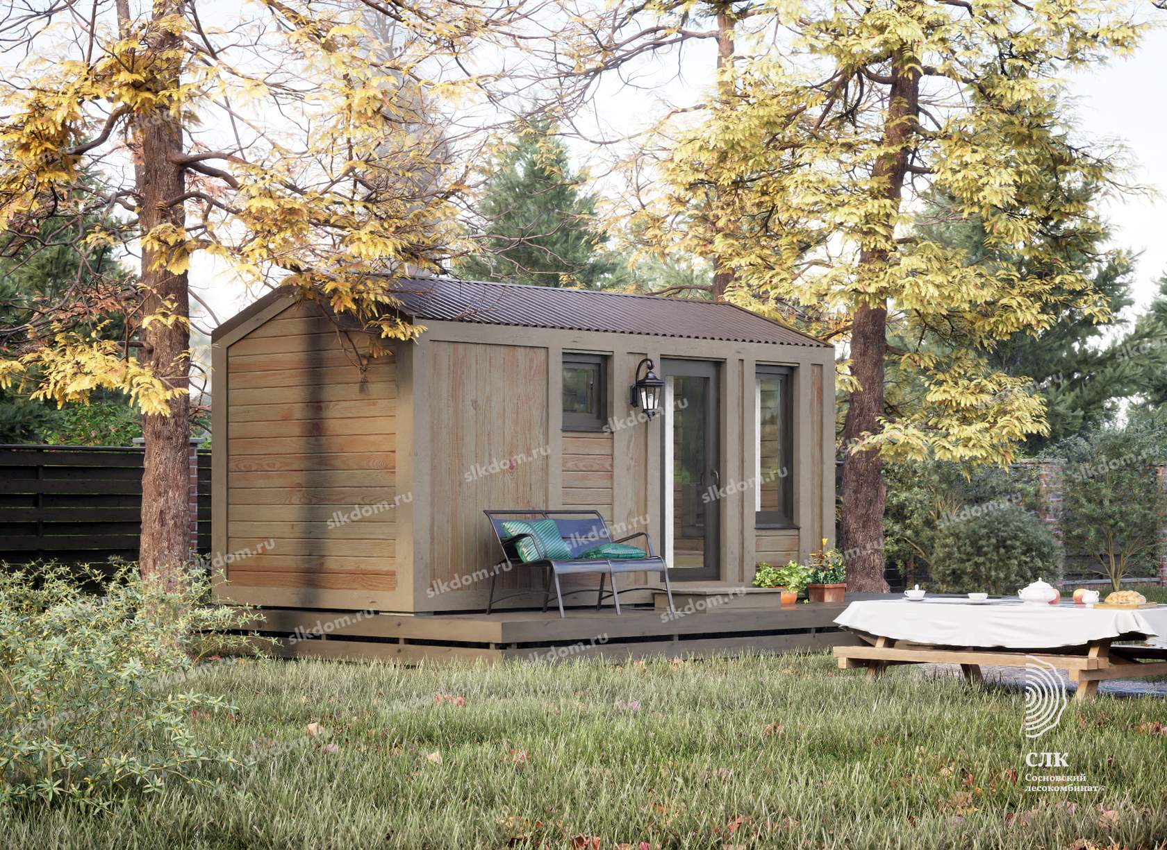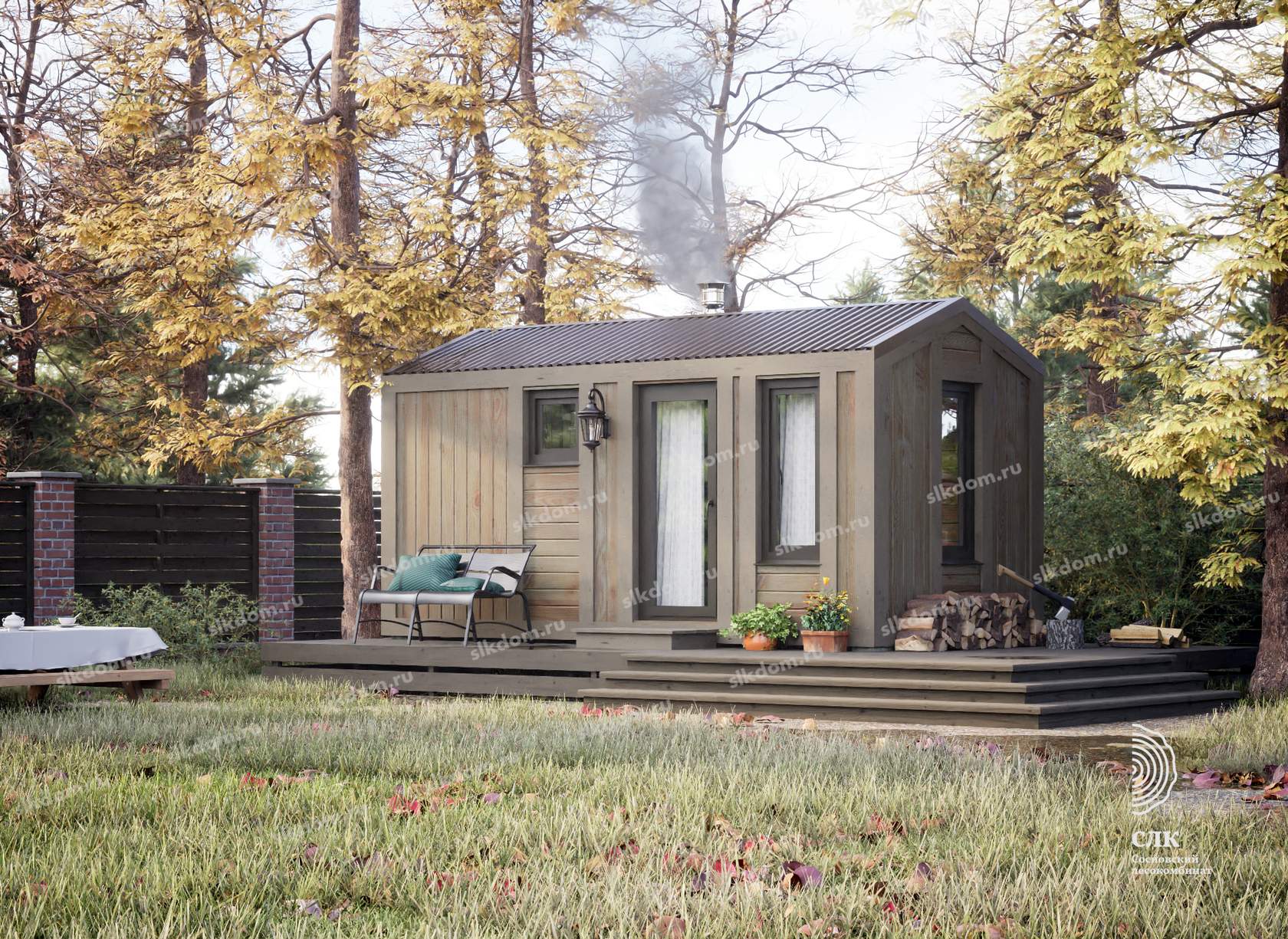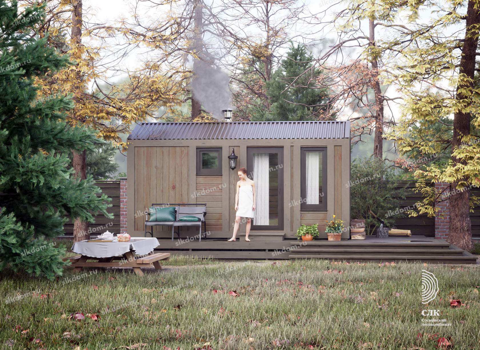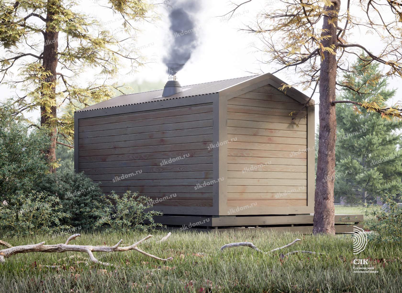 Покрытие корпуса бани - два слоя лессирующей краски с антисептиком, цвета на выбор из каталога, есть доп. опция – заменить лессирующую краску на укрывного типа.