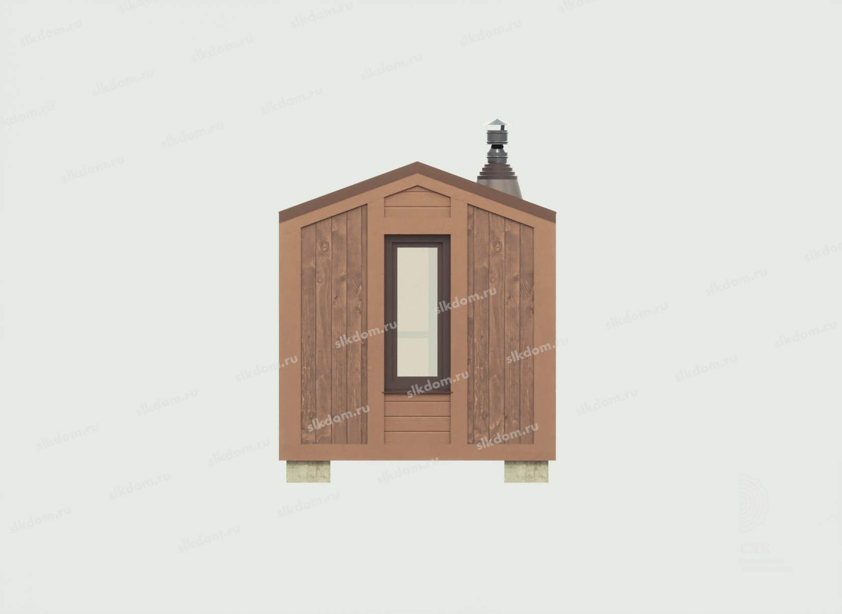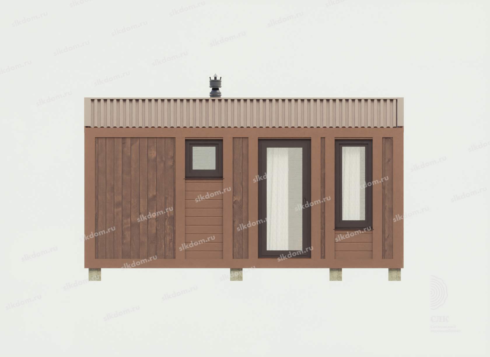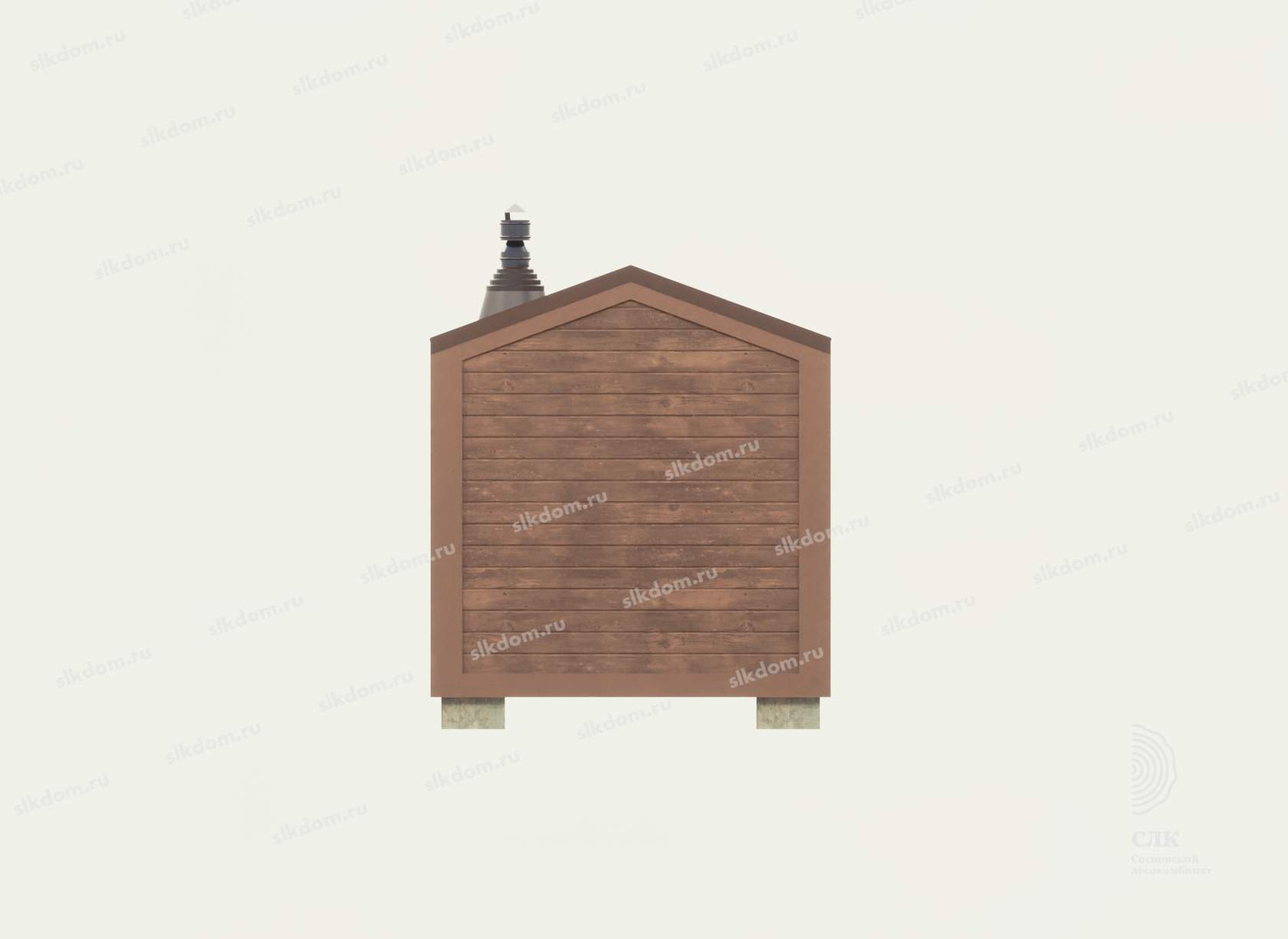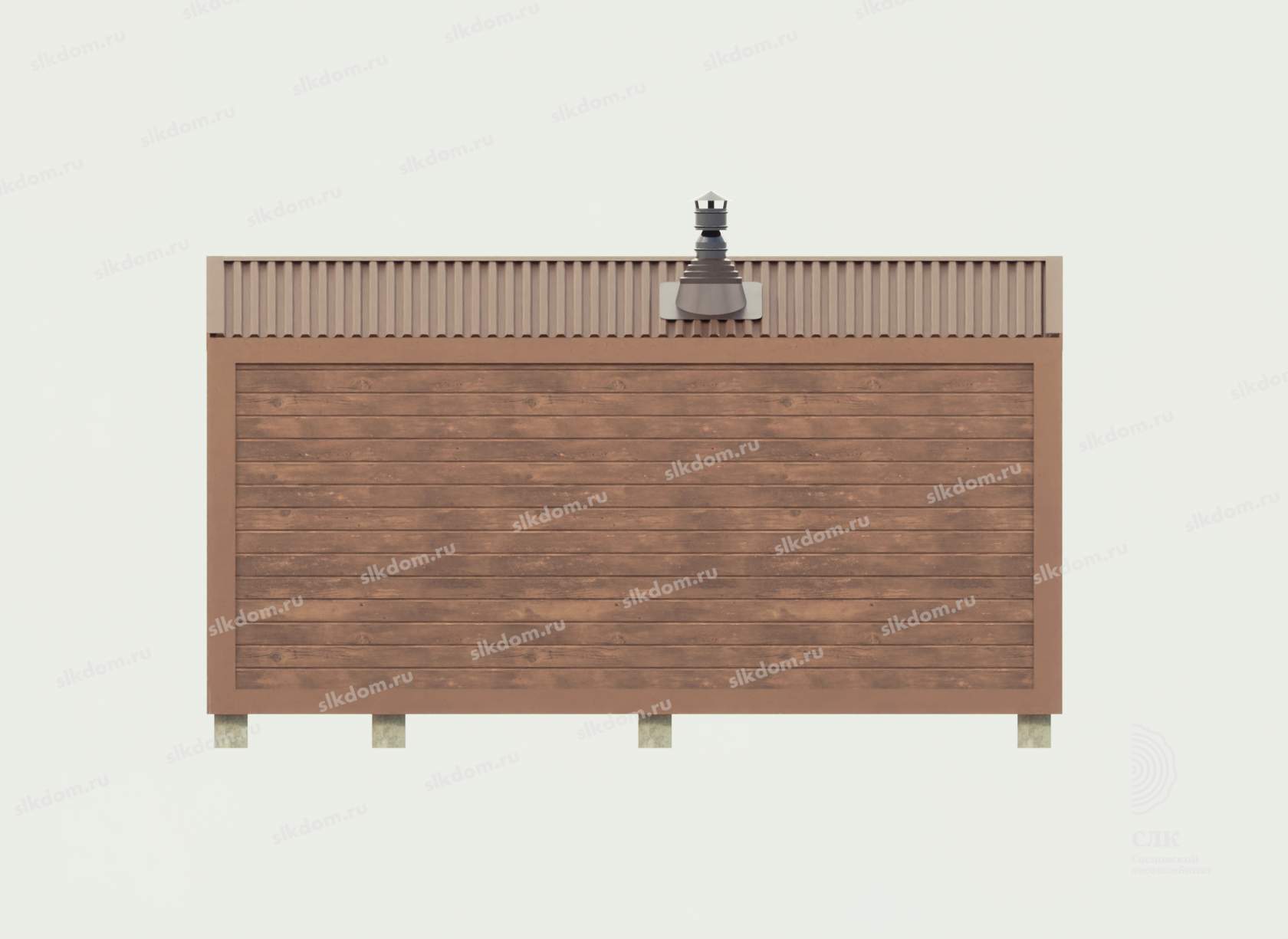 Поверх укладывается доска по длинной части кровли 100x25 мм с шагом 33 см, материал хвоя, ест. влажности. Покрытие кровли - профлист, размер листа 1200х2000 мм, толщина 0,45 мм, цвет на выбор - коричневый, серый, бордовый и зеленый. Покрытие кровли всегда можно заменить на другой материал, цены уточняйте. По краям кровли крепится торцевая планка из оцинкованного металла с полимерным покрытием.