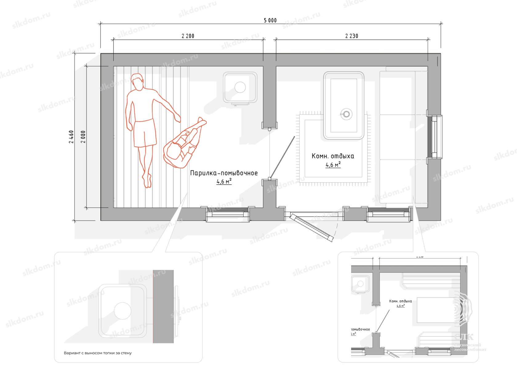 В комнате отдыха, в зависимости от длины бани окна ПВХ ламинированные с двойным стеклопакетом 600x1000 или 600x1400 (поворотно-откидные). Окна возможно добавлять и изменять размеры - уточняйте!