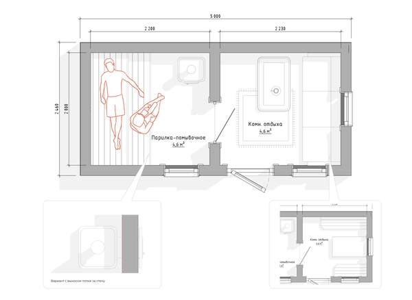 Отверстие под слив воды выполняется в помывочном отделении в которое установлена пластиковая труба с воронкой размер трубы 11 см, если помывочное отделение отсутствует - слив размещается в парном отделении или в помывочном отделении, если такое пристуствует на плане. Работы по отводу воды выполняются заказчиком. Края отверстия обрабатываются антисептиком.