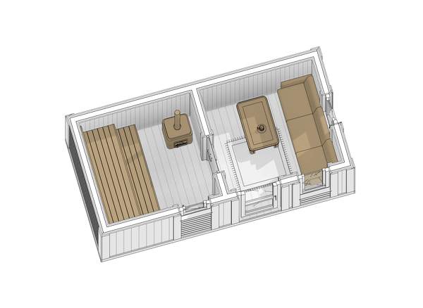 Комфортное размещение от трех до четырех человек. Сделано по каркасной технологии: в стенах, кровле и в полу 100 мм утеплителя. Комплектация бани - готовая к применению после установки на участке.
