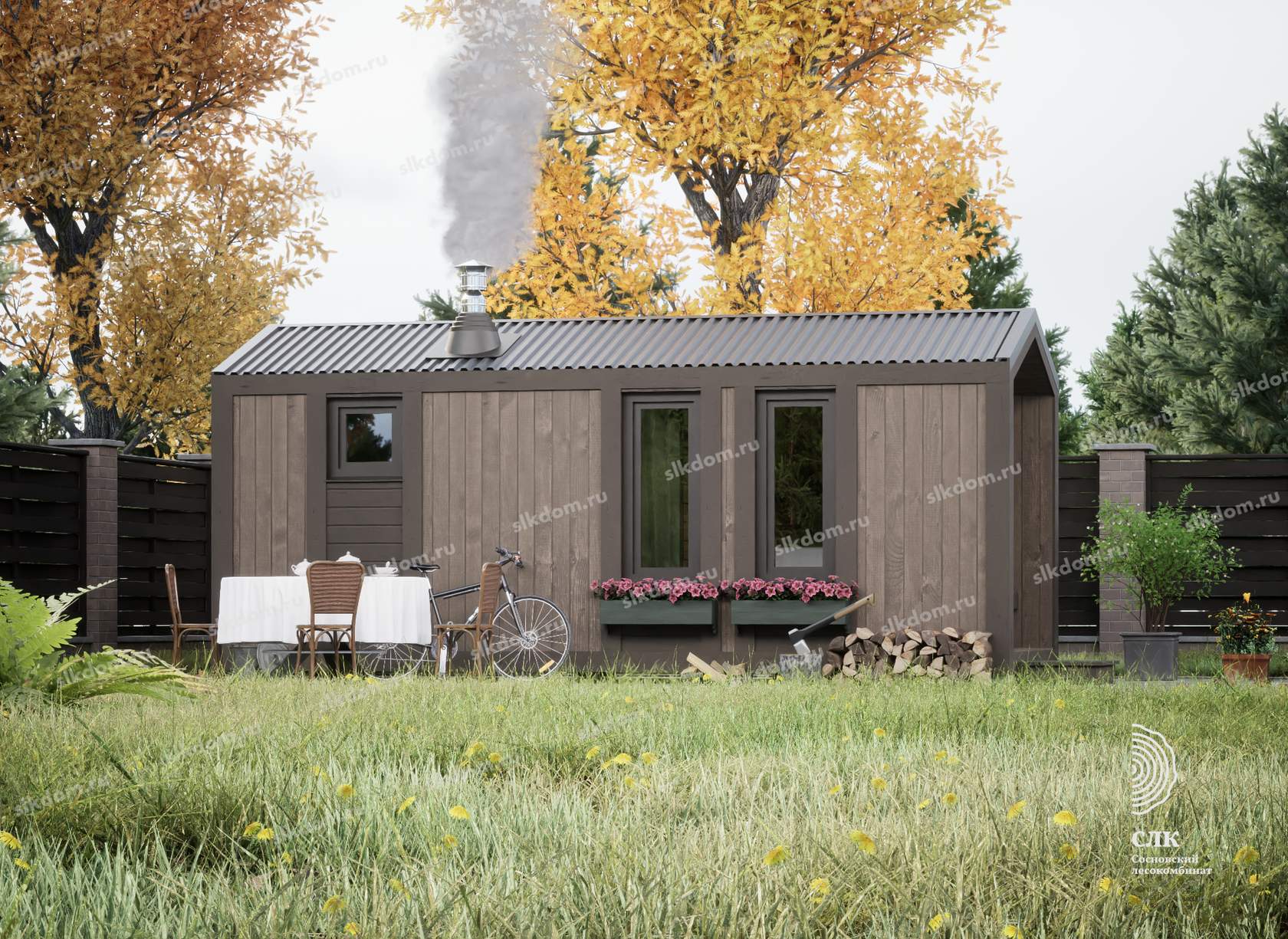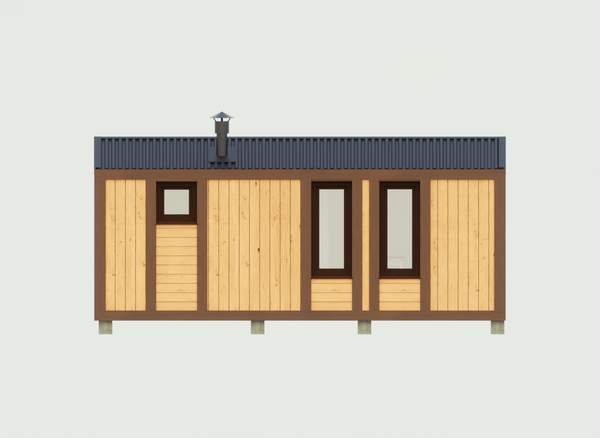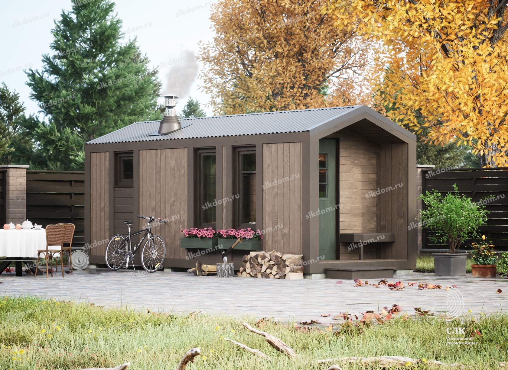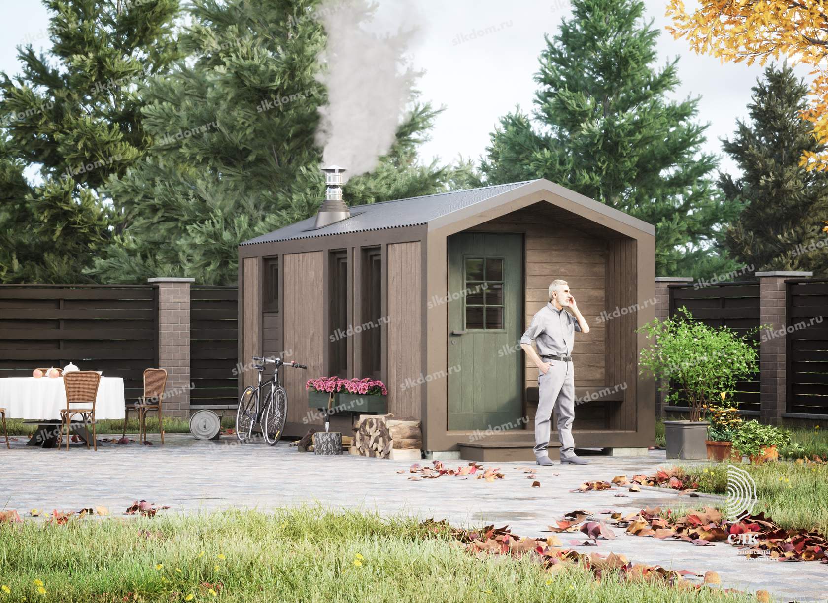 Мобильная баня в стиле барнхаус с крыльцом на три помещения - парная, помывочная и комната отдыха.