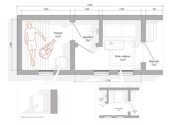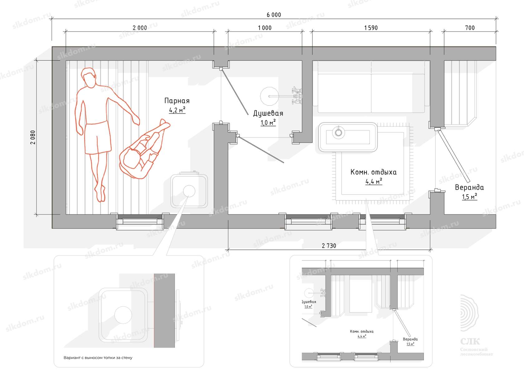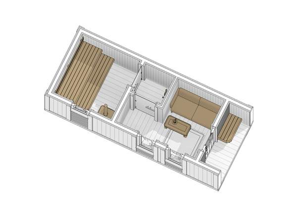Комната отдыха в наполненении свободной планировки, на схеме приведен пример размещения мебели. Мебель в стоимость не входит и расчитывается отдельно, за исключением полога (пологов) в варианте с крыльцом, расположение пологов согласно схемы планировки, материал - строганая доска камерной сушки, хвоя.