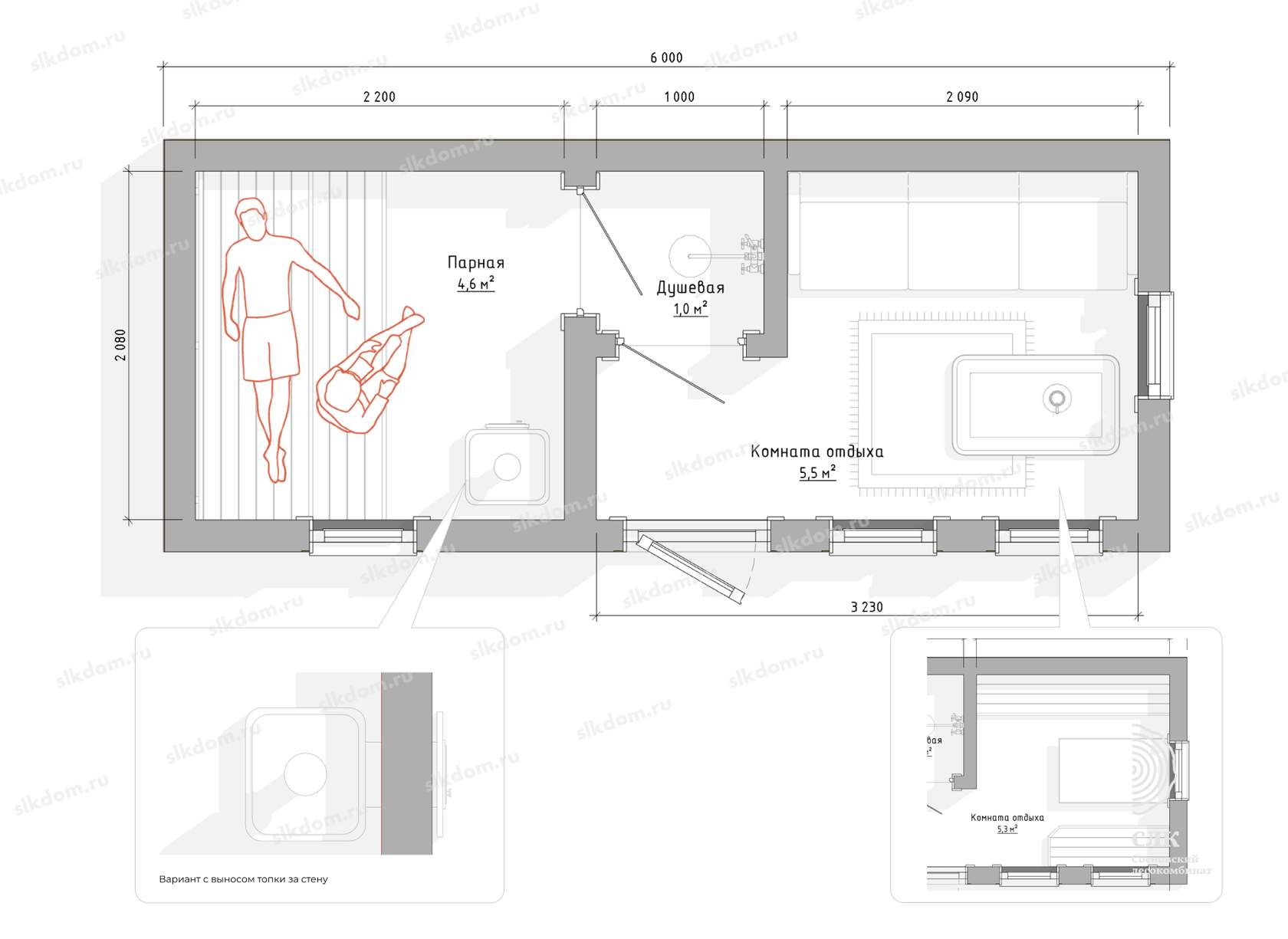 Комната отдыха в наполненении свободной планировки, на схеме приведен пример размещения мебели. Мебель в стоимость не входит и расчитывается отдельно, за исключением полога (пологов) в варианте с крыльцом, расположение пологов согласно схемы планировки, материал - строганая доска камерной сушки, хвоя.