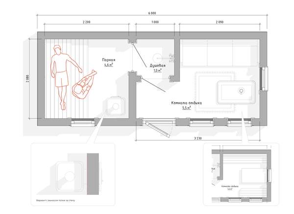Печь дровяная Везувий с чугунной дверцей, изображена на фото, топка в базовой комплектации осуществляется из парного помещения (топку есть возможность вынести за стену - доп. опция, также печь можно заменить на любую другую, даже электрическую). Защита от нагрева на полу и стене – плита огнезащитная Минерит, толщина 1 см. Камни печные Габбро-диабаз 40 кг для верхней загрузки печи (общая вместимость печи 120 кг, укладываются по бокам, есть возможность заказать под полную загрузку).