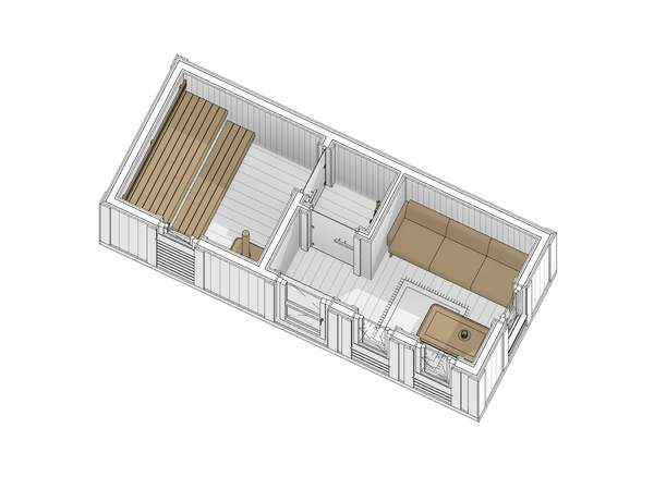 Комфортное размещение от трех до четырех человек. Сделано по каркасной технологии: в стенах, кровле и в полу 100 мм утеплителя. Комплектация бани - готовая к применению после установки на участке.