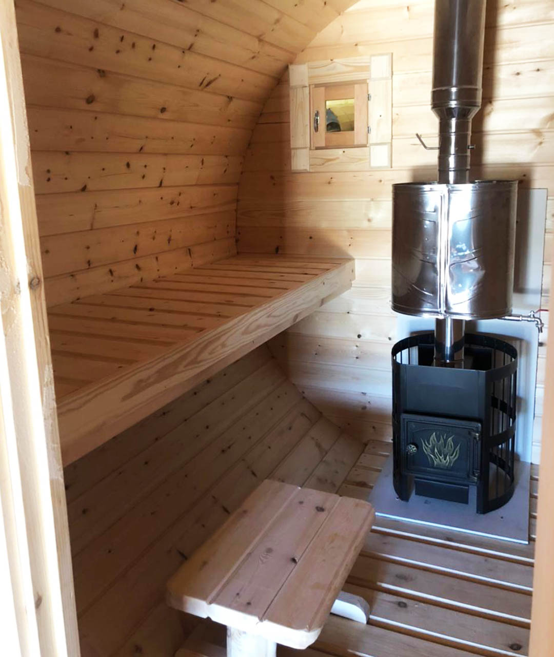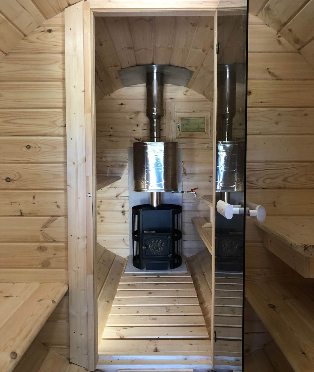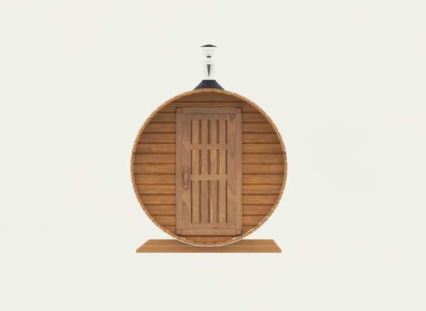 Корпус по наружней стороне стянут обручами из оцинкованного металла толщиной 2 мм, есть возможность подтянуть и ослабить на летний и зимний период использования бани.