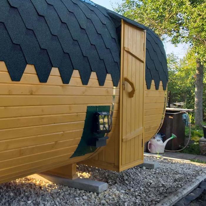 Баня-бочка на одно помещение - парная. Не дорогое решение которое можно использовать как отдельно стоящую пристройку к вашему дому или гостевому домику.