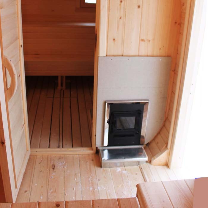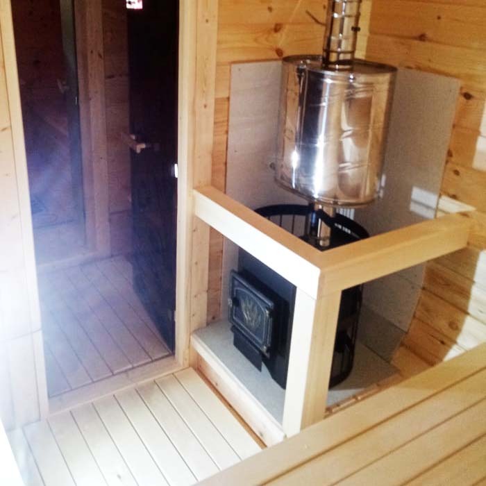 Печь дровяная Везувий с чугунной дверцей, изображена на фото, топка в базовой комплектации осуществляется из парного помещения (топку есть возможность вынести за стену - доп. опция, так же печь можно заменить на любую другую, даже электрическую). Защита от нагрева на полу и стене – плита огнезащитная Минерит, толщина 1 см. Камни печные Габбро-диабаз 40 кг для верхней загрузки печи (общая вместимость печи 120 кг, укладываются по бокам, есть возможность заказать).