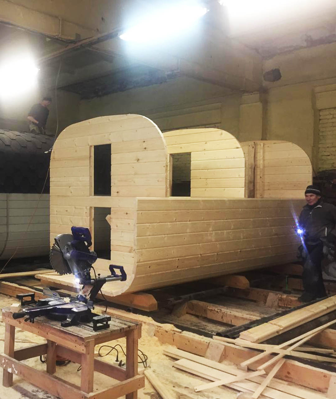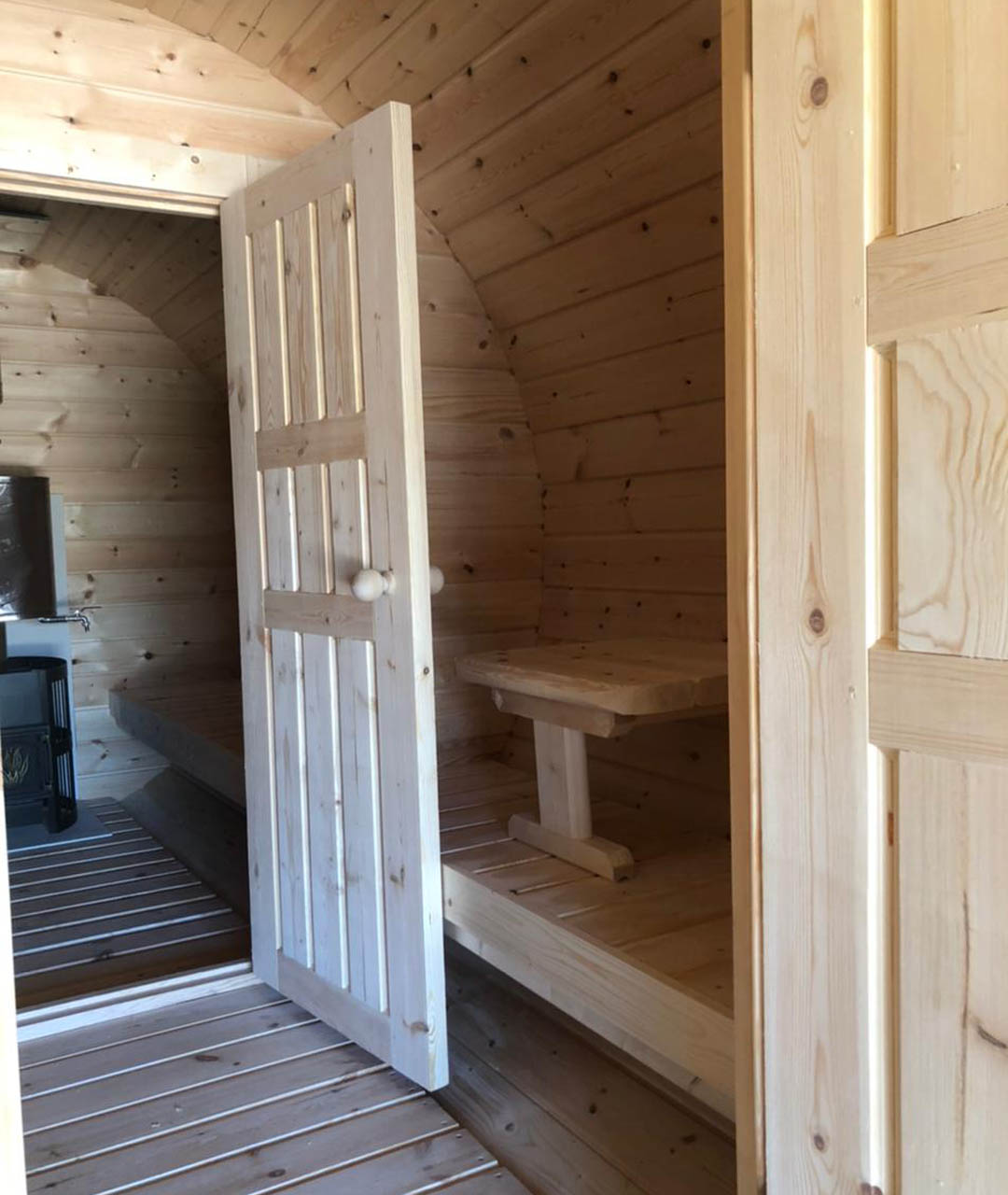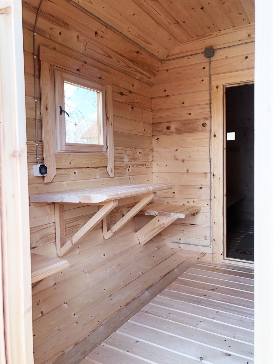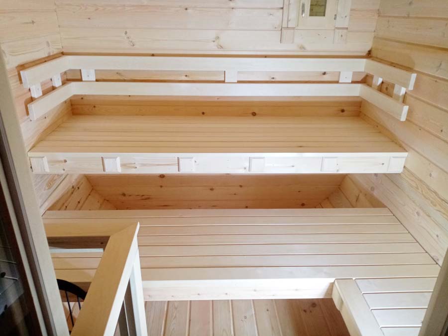 Комфортное размещение в парной от двух до трех человек. Две типовые планировки. Сделано из бруса толщиной 45 мм, материал хвоя с возможностью изменить на более дорогую древесину.