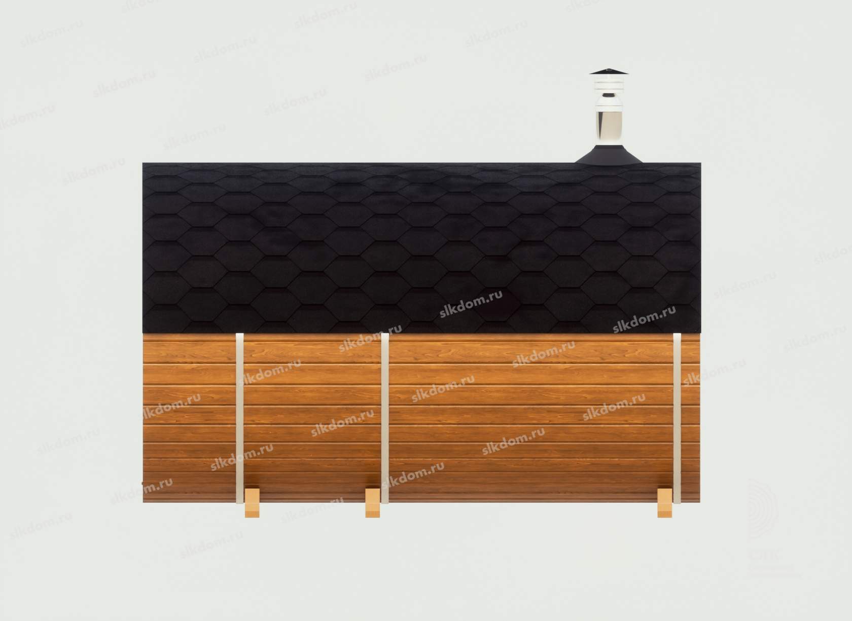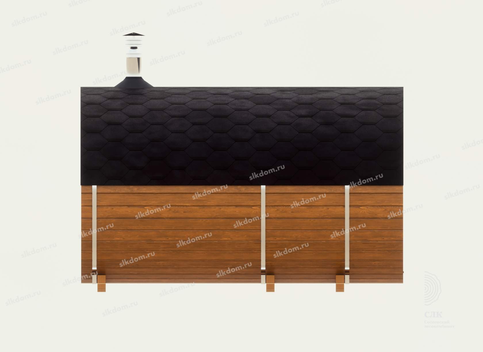 Корпус бани и внутренние перегородки выполнены из сухой доски камерной сушки (влажностью не более 16%), материал хвоя, ламели (доска) запилены в лунный паз и состыкованы между собой, размер 145x45 мм. Ширина и высота корпуса 210 см по внешней стороне.