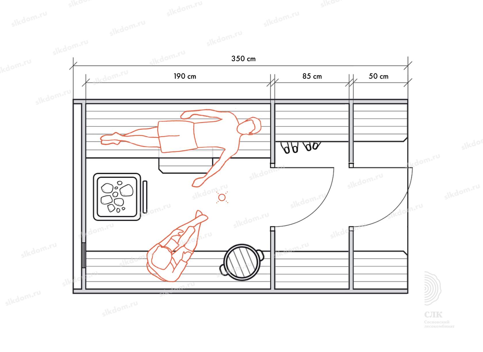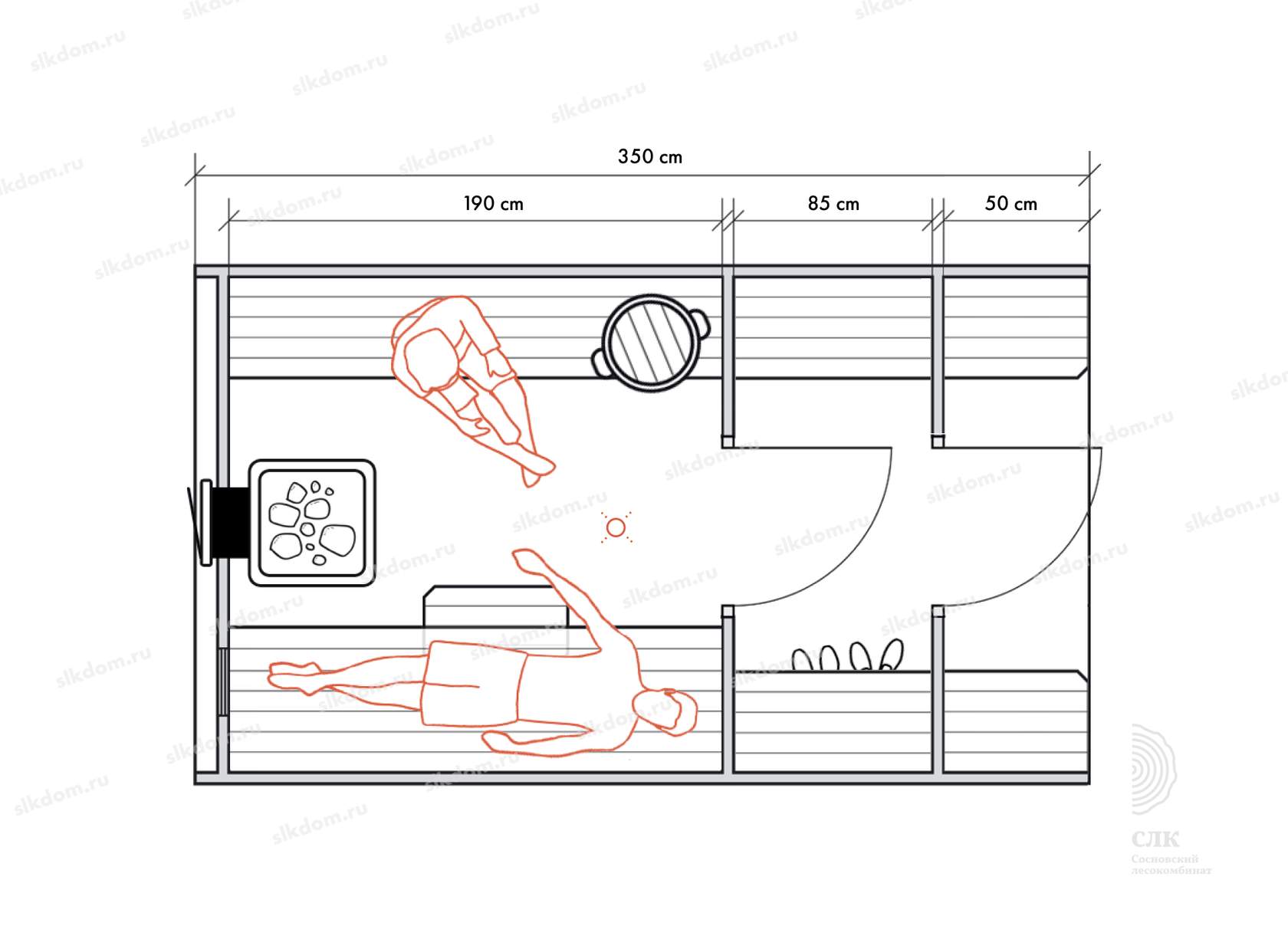 Стены можно двигать - увеличивая или уменьшая помещения, высоту и глубину полков можно менять, расположение тоже, добавлять и убирать дополнительные окна, выносить топку печи или кран с горячей водой за стену. Это все обсуждаемо, мы за расчет не берем деньги! У нас собственное производство, для нас каждая баня - индивидуальная!