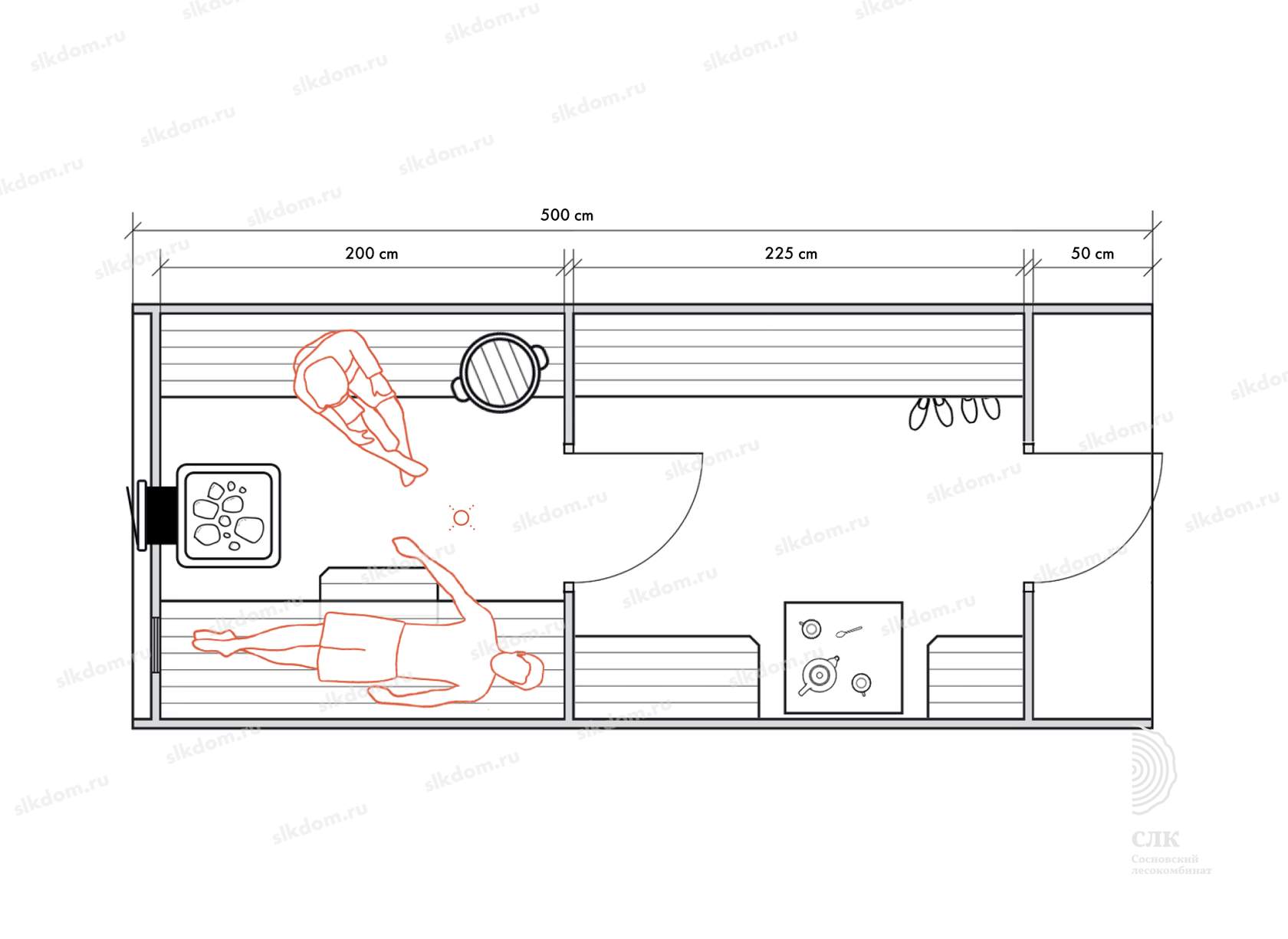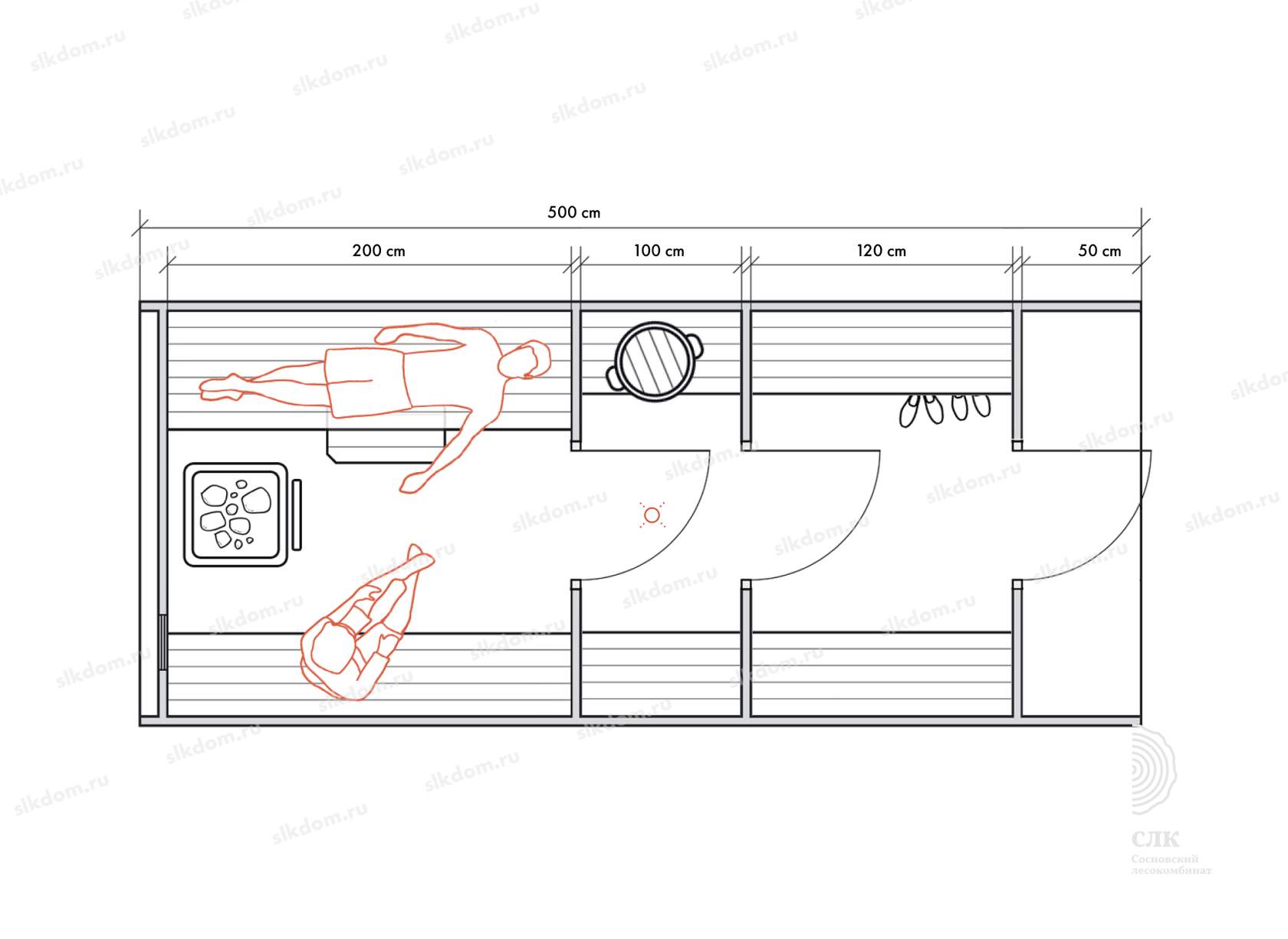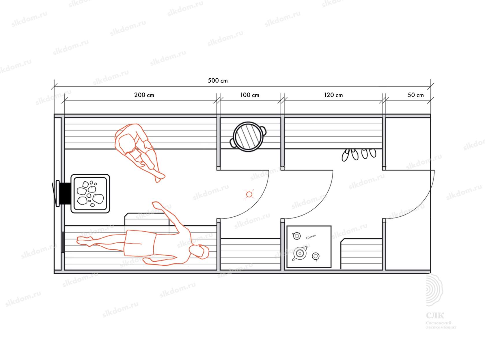 Стены можно двигать - увеличивая или уменьшая помещения, высоту и глубину полков можно менять, расположение тоже, добавлять и убирать дополнительные окна, выносить топку печи или кран с горячей водой за стену. Это все обсуждаемо, мы за расчет не берем деньги! У нас собственное производство, для нас каждая баня - индивидуальная!