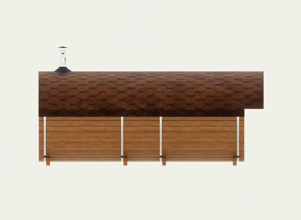Корпус бани и внутренние перегородки выполнены из сухой доски камерной сушки (влажностью не более 16%), материал хвоя, ламели (доска) запилены в лунный паз и состыкованы между собой, размер 145x45 мм. Ширина и высота корпуса 210 см по внешней стороне.