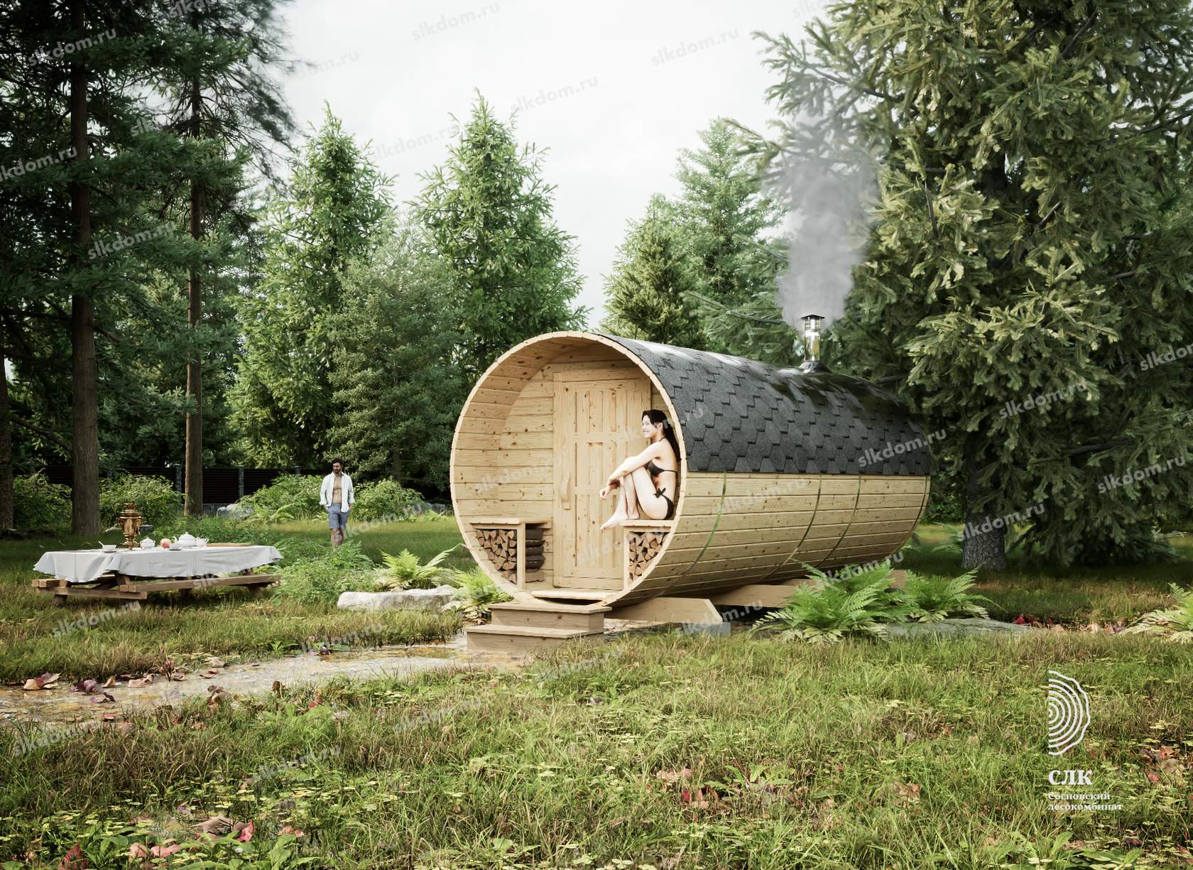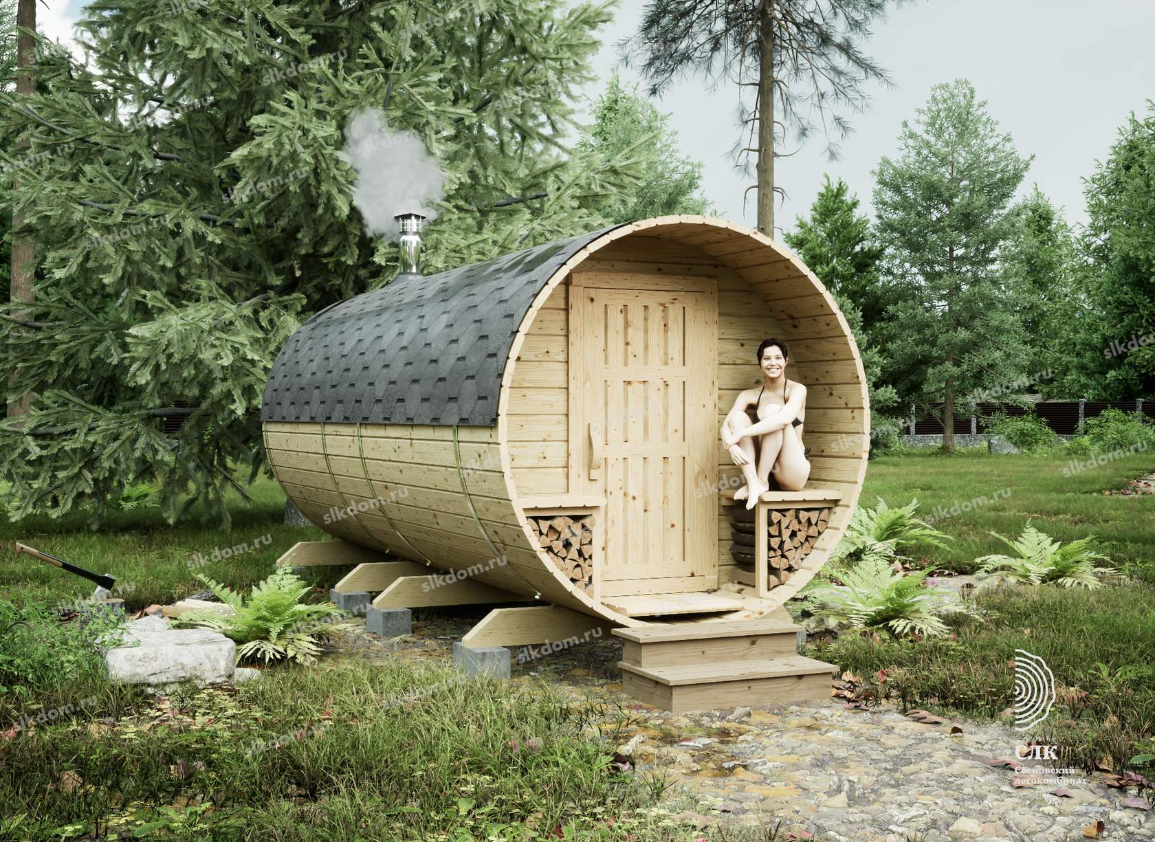 Баня-бочка на три помещения - парная, помывочная и предбанник. Комфортное размещение от трех до четырех человек.