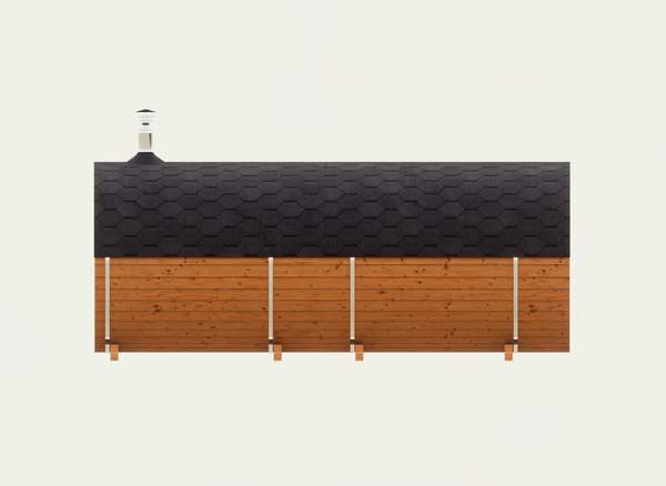 Корпус бани и внутренние перегородки выполнены из сухой доски камерной сушки (влажностью не более 16%), материал хвоя, ламели (доска) запилены в лунный паз и состыкованы между собой, размер 145x45 мм. Ширина и высота корпуса 230 см по внешней стороне.