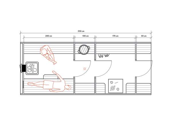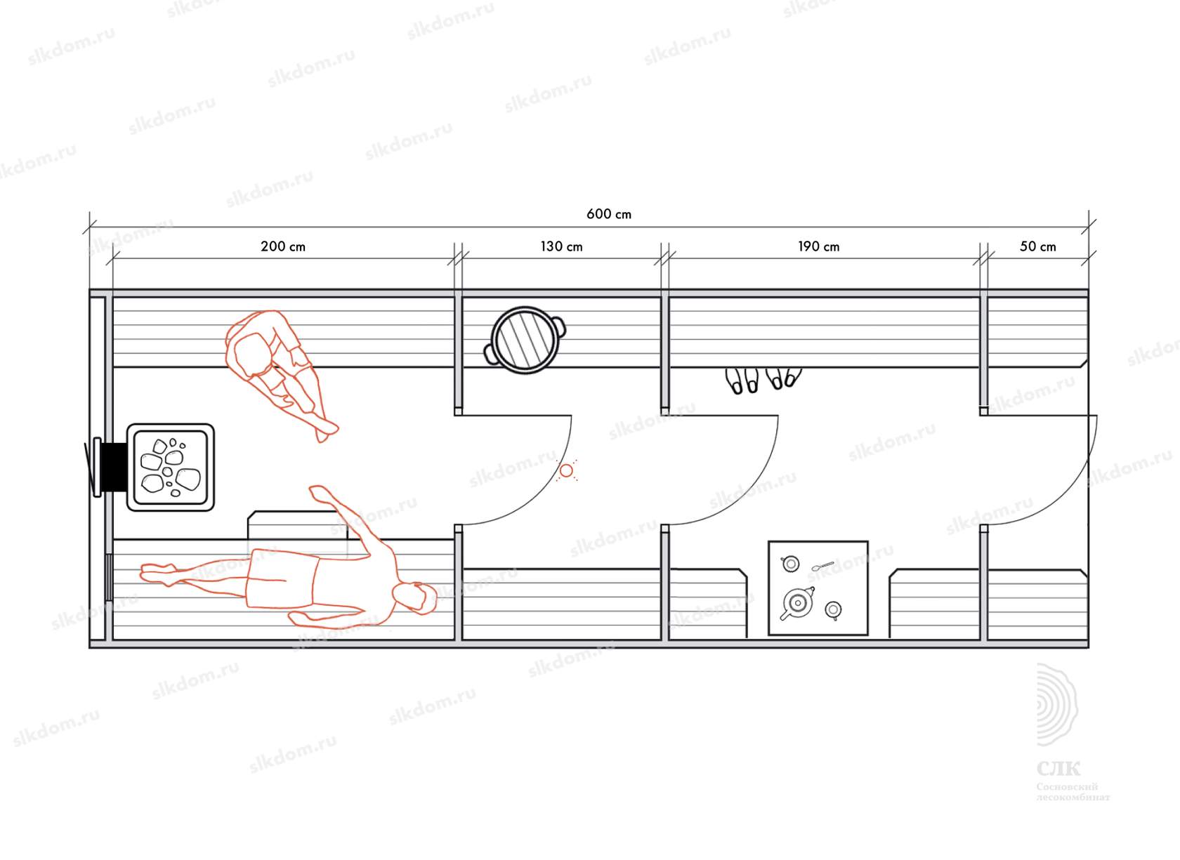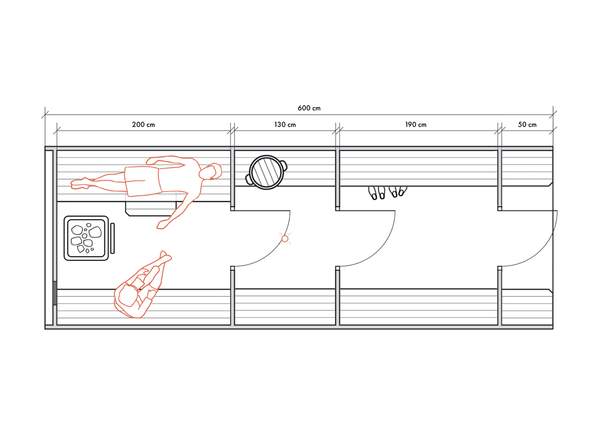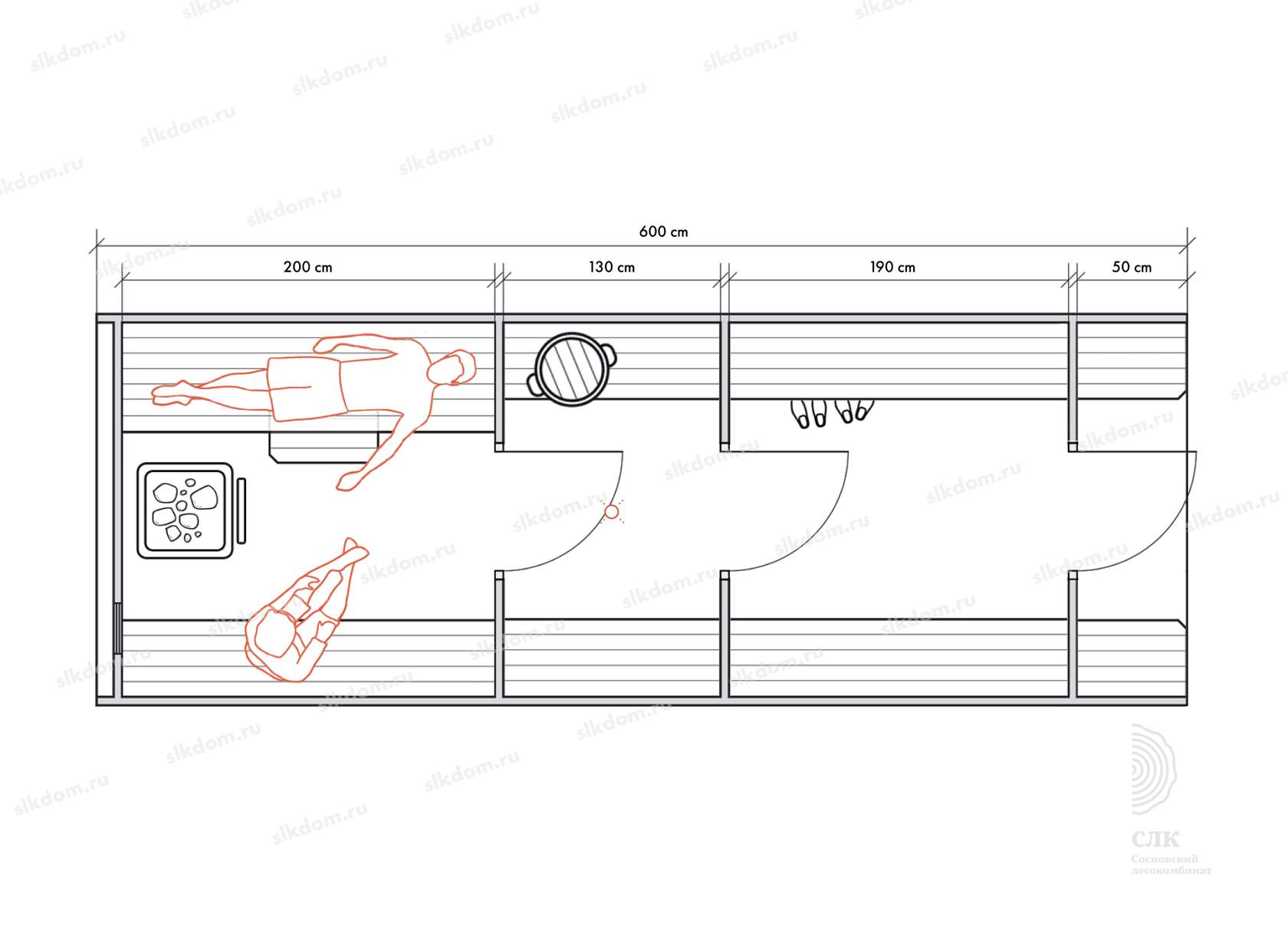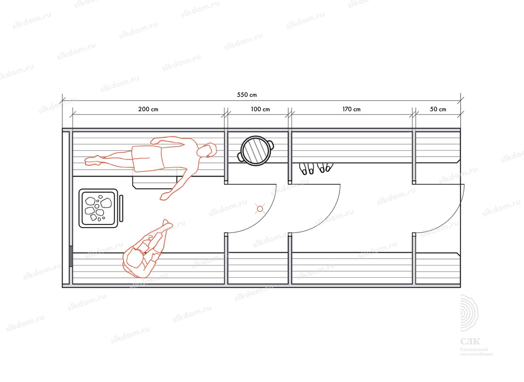 Несмотря на небольшие размеры, в данном типе бань можно обустроить все необходимые для комфортных банных процедур зоны для 2-4 человек.