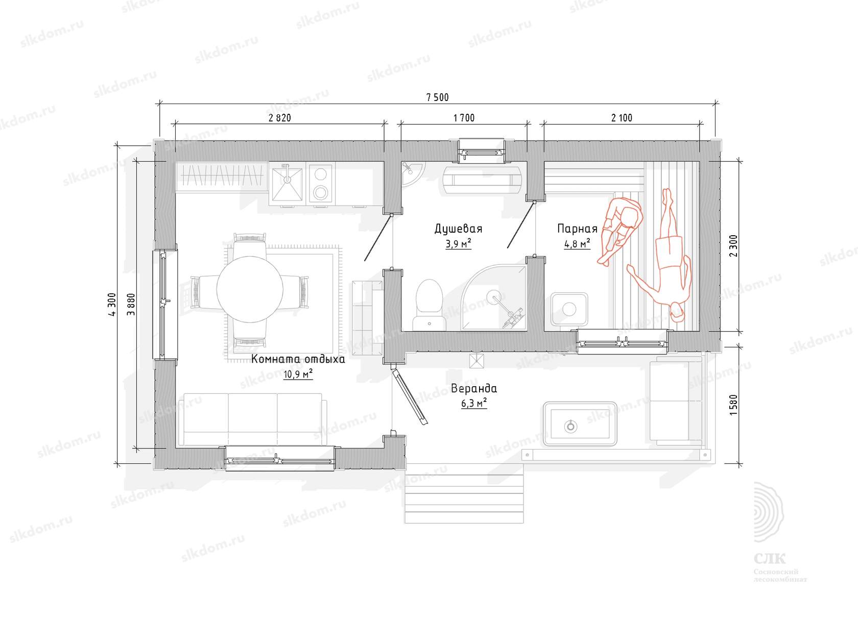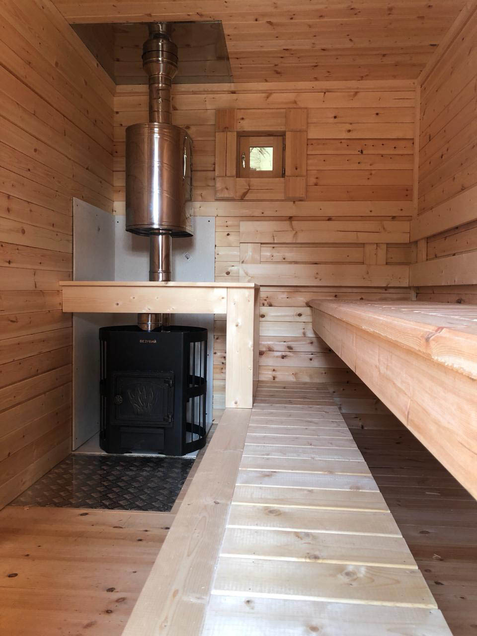 Расположение полков в парном помещении согласно схемы планировки – лежачий и сидячий полог, материал осина. Внутренняя отделка стен и потолка - вагонка осина Евро сорт А 12,5x96 мм. Полы плитка керамическая.