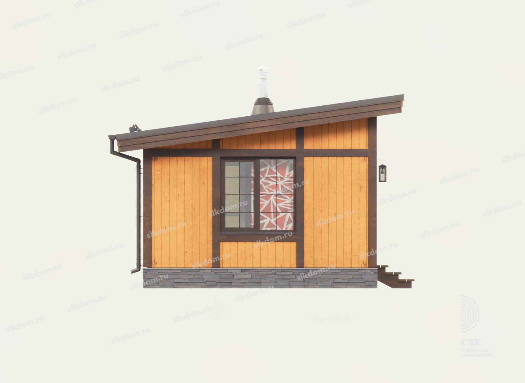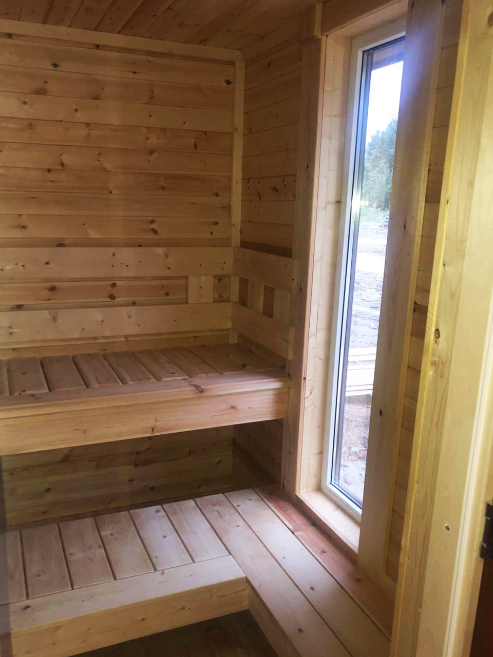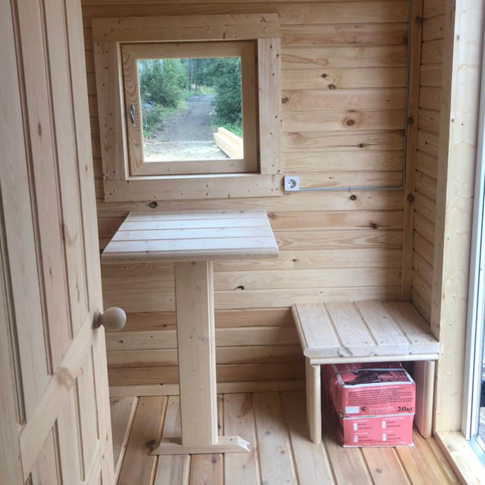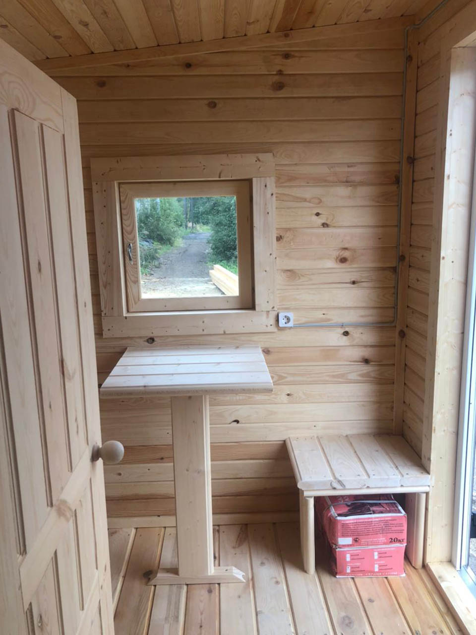 ПВХ профиль Forte 58 2XRenolit два стекла - однокамерные, с ламинацией. В парном помещении деревянное окно. Наличники наружные из доски 20x145 мм камерной сушки, внутренние 20x95 мм.