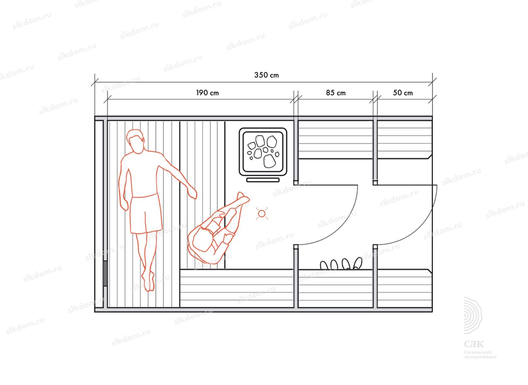 Стены можно двигать - увеличивая или уменьшая помещения, высоту и глубину полков можно менять, расположение тоже, добавлять и убирать дополнительные окна, выносить топку печи или кран с горячей водой за стену. Это все обсуждаемо, мы за расчет не берем деньги! У нас собственное производство, для нас каждая баня - индивидуальная!
