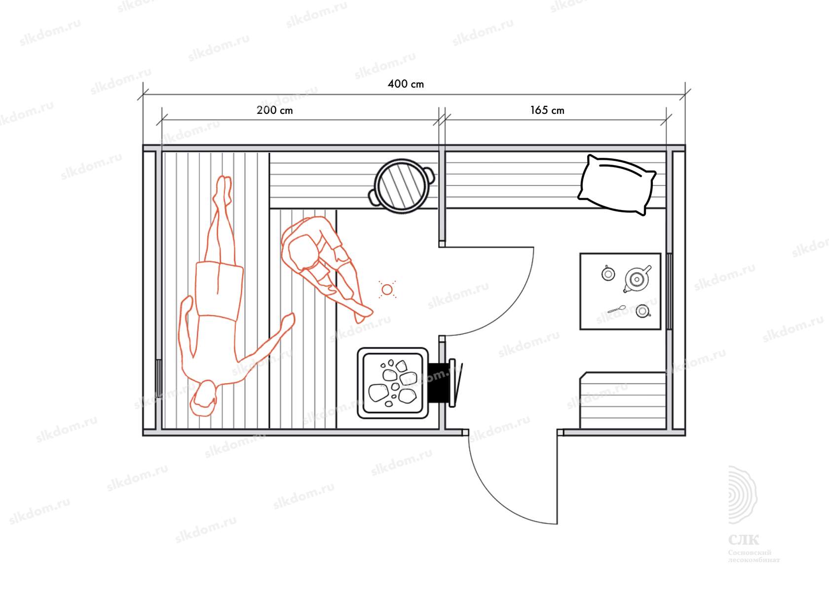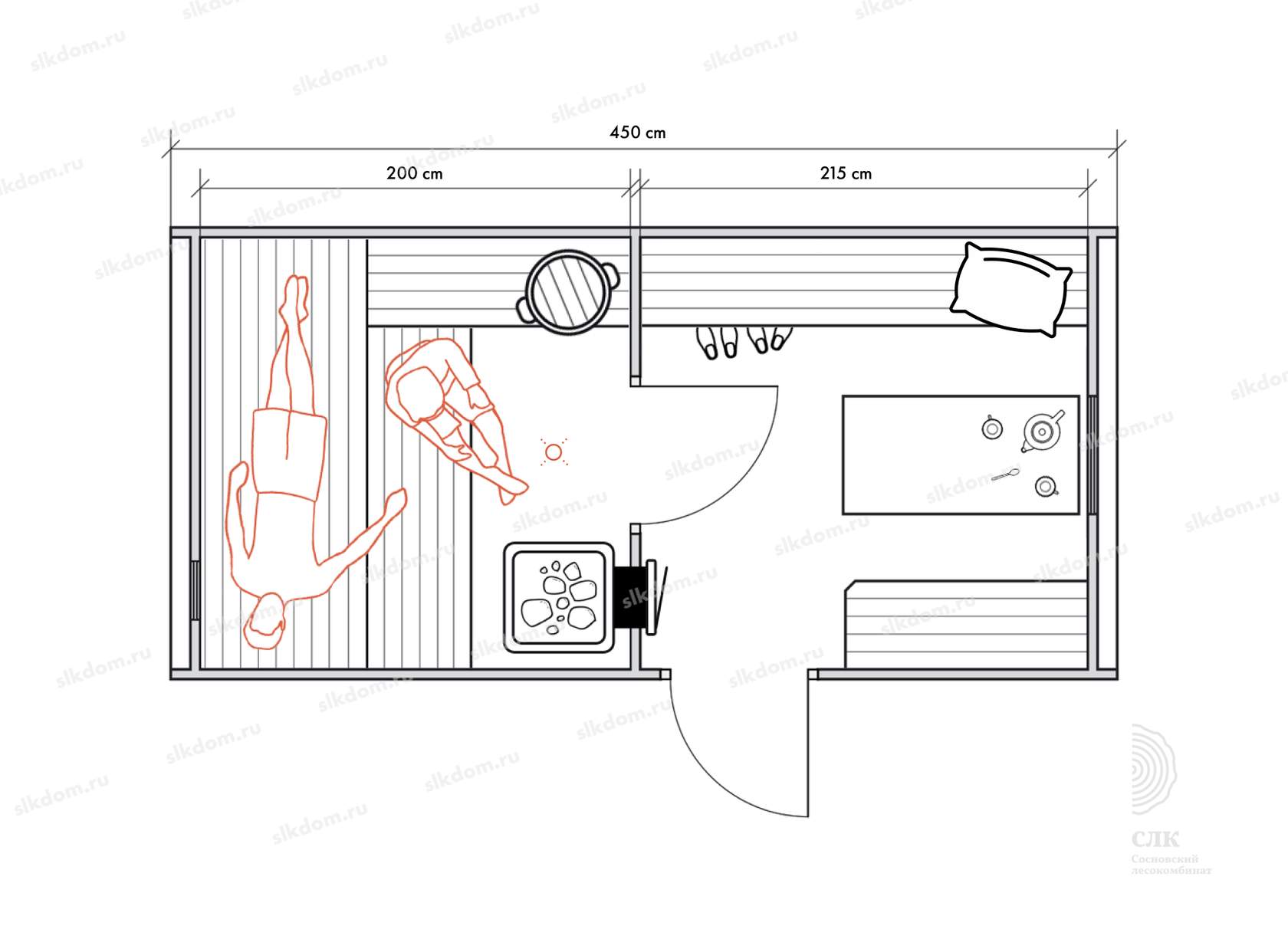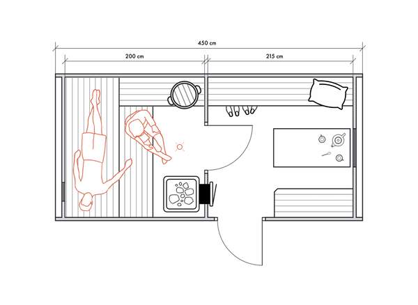 Несмотря на небольшие размеры, в данном типе бань можно обустроить все необходимые для комфортных банных процедур зоны для 2-4 человек.