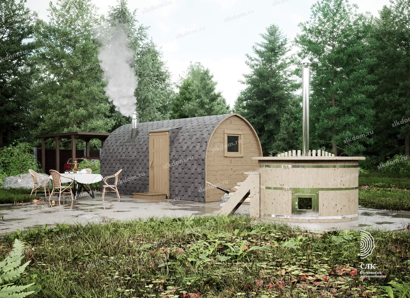 Конструкция весит не более 2 тонн, поэтому в транспортировке она предельно проста. Более того, такую баню можно неоднократно перемещать с места на место.
