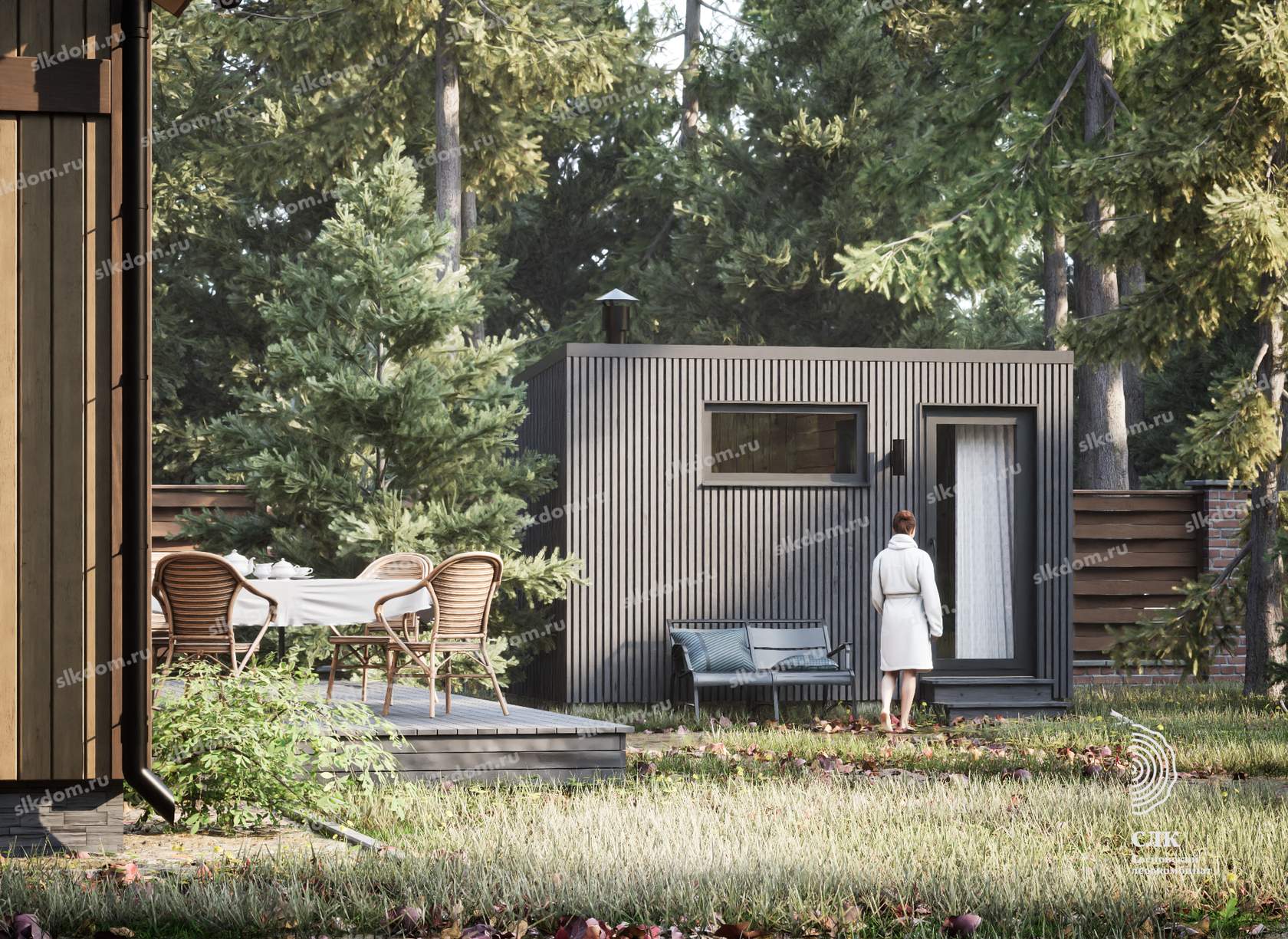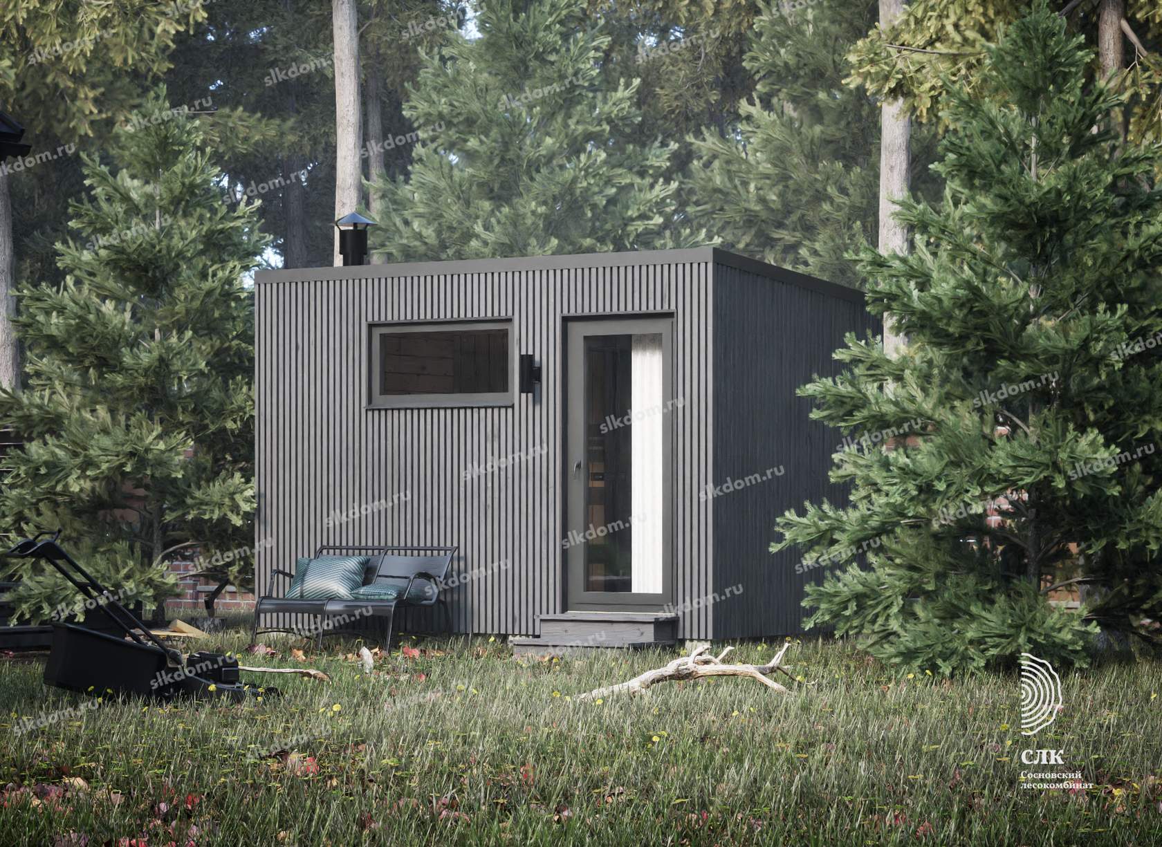 Покрытие корпуса бани - два слоя лессирующей краски с антисептиком, цвета на выбор из каталога, есть доп. опция – заменить лессирующую краску на укрывного типа.