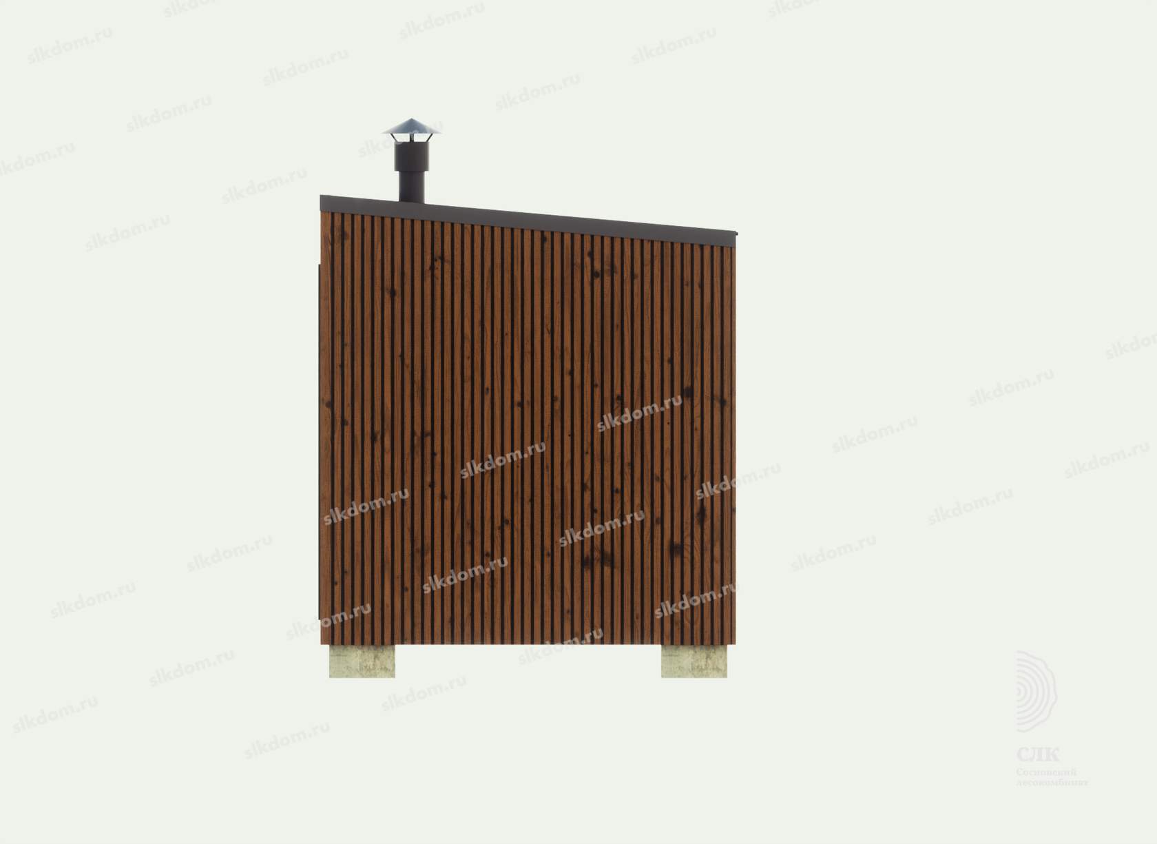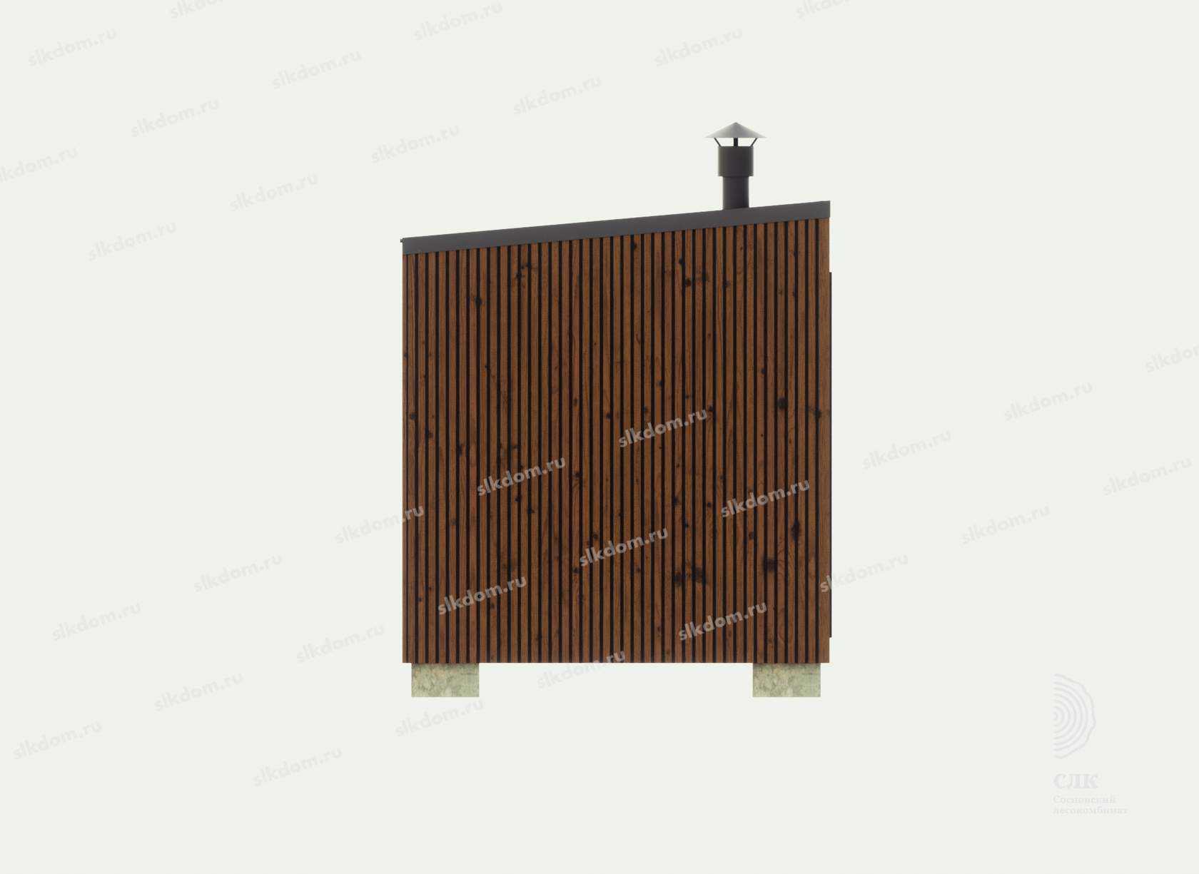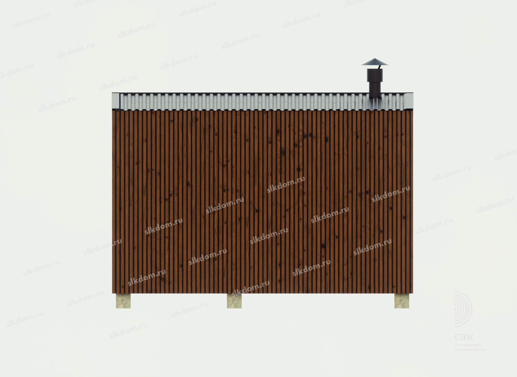 Поверх укладывается доска по длинной части кровли 100x25 мм с шагом 33 см, материал хвоя, ест. влажности. Покрытие кровли - профлист, размер листа 1200х2000 мм, толщина 0,45 мм, цвет на выбор - коричневый, серый, бордовый и зеленый. Покрытие кровли всегда можно заменить на другой материал, цены уточняйте. По краям кровли крепится торцевая планка из оцинкованного металла с полимерным покрытием.