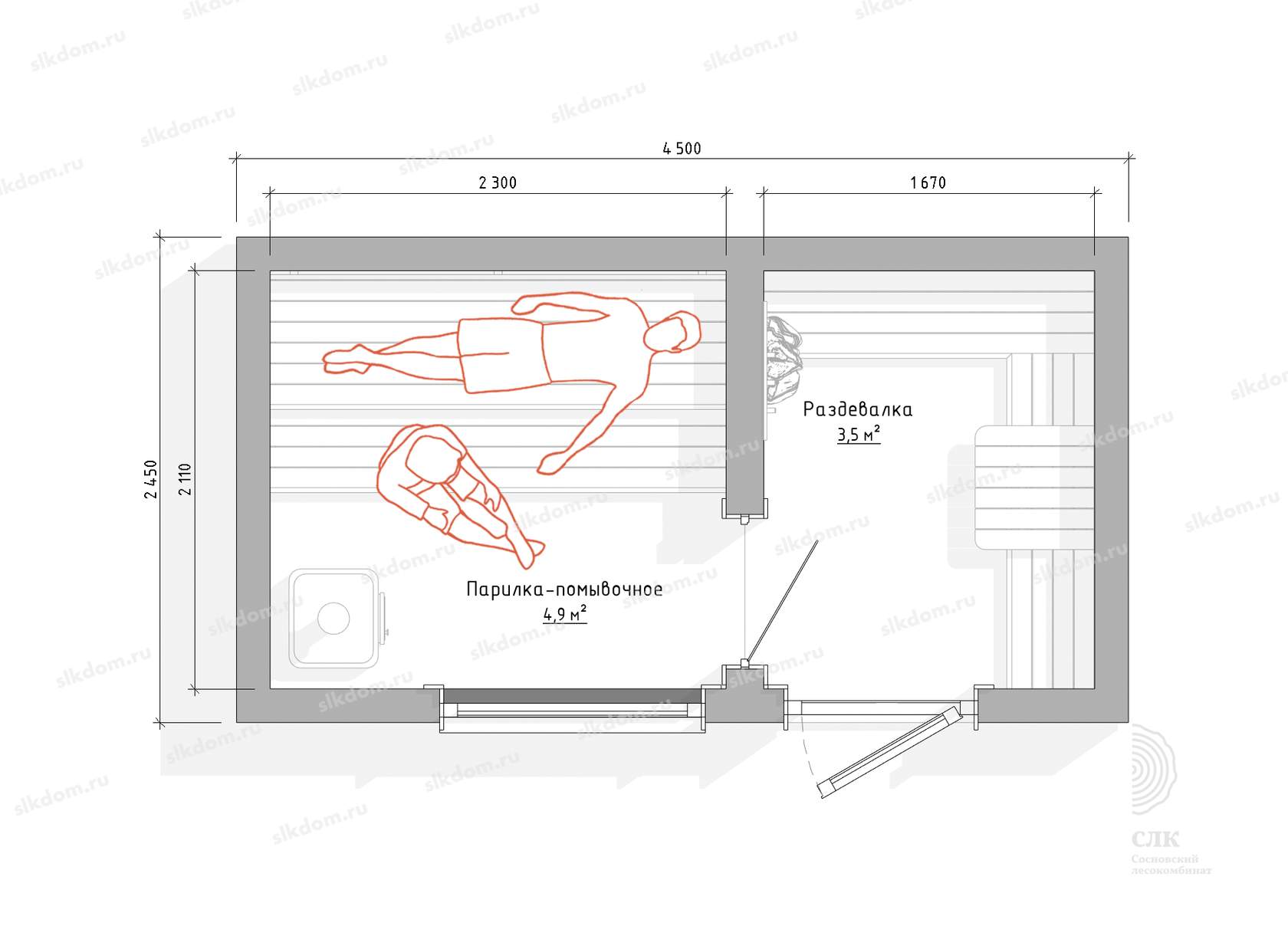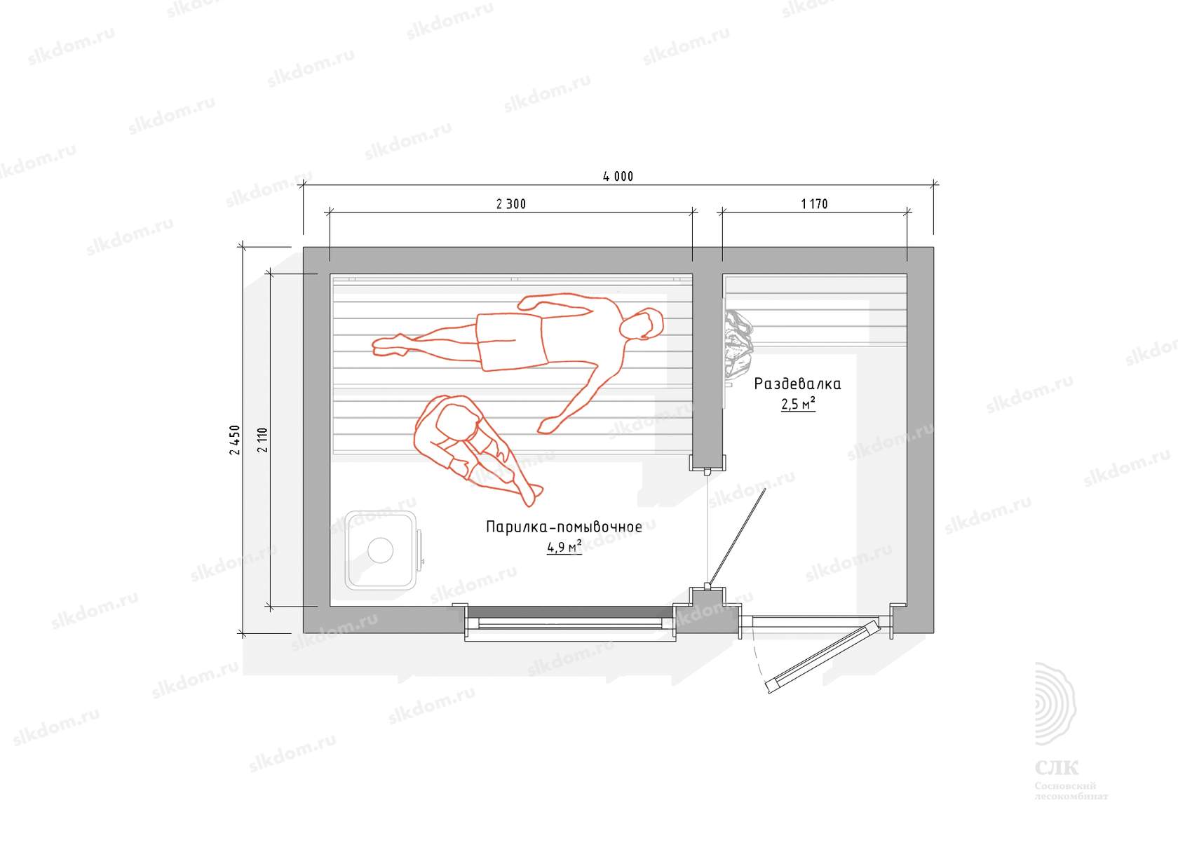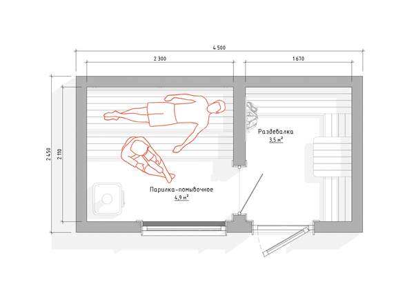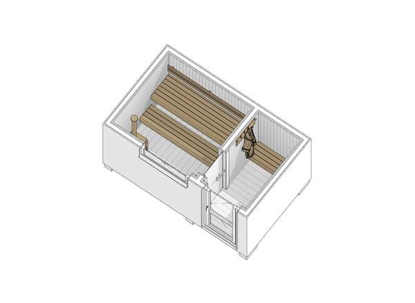 Базовое наполнение бани включает в себя установку пологов в парном помещении, согласно схемы планировки – лежачий и сидячий полог. Сидячий глубина 45 см высота 43 см, лежачий - глубина 70 см, высота 90 см. Сидячий полог может быть выдвижным - доп. опция, стоимость уточняйте.
