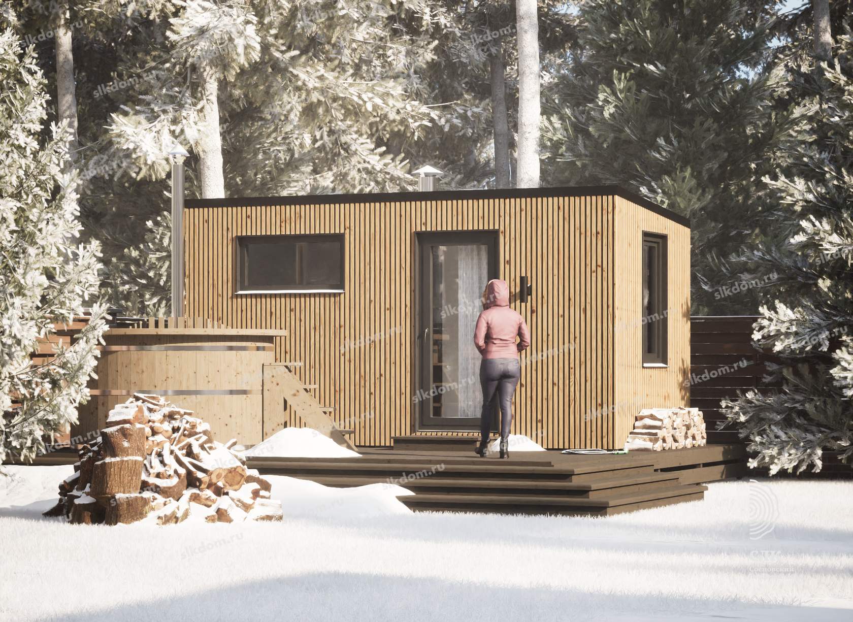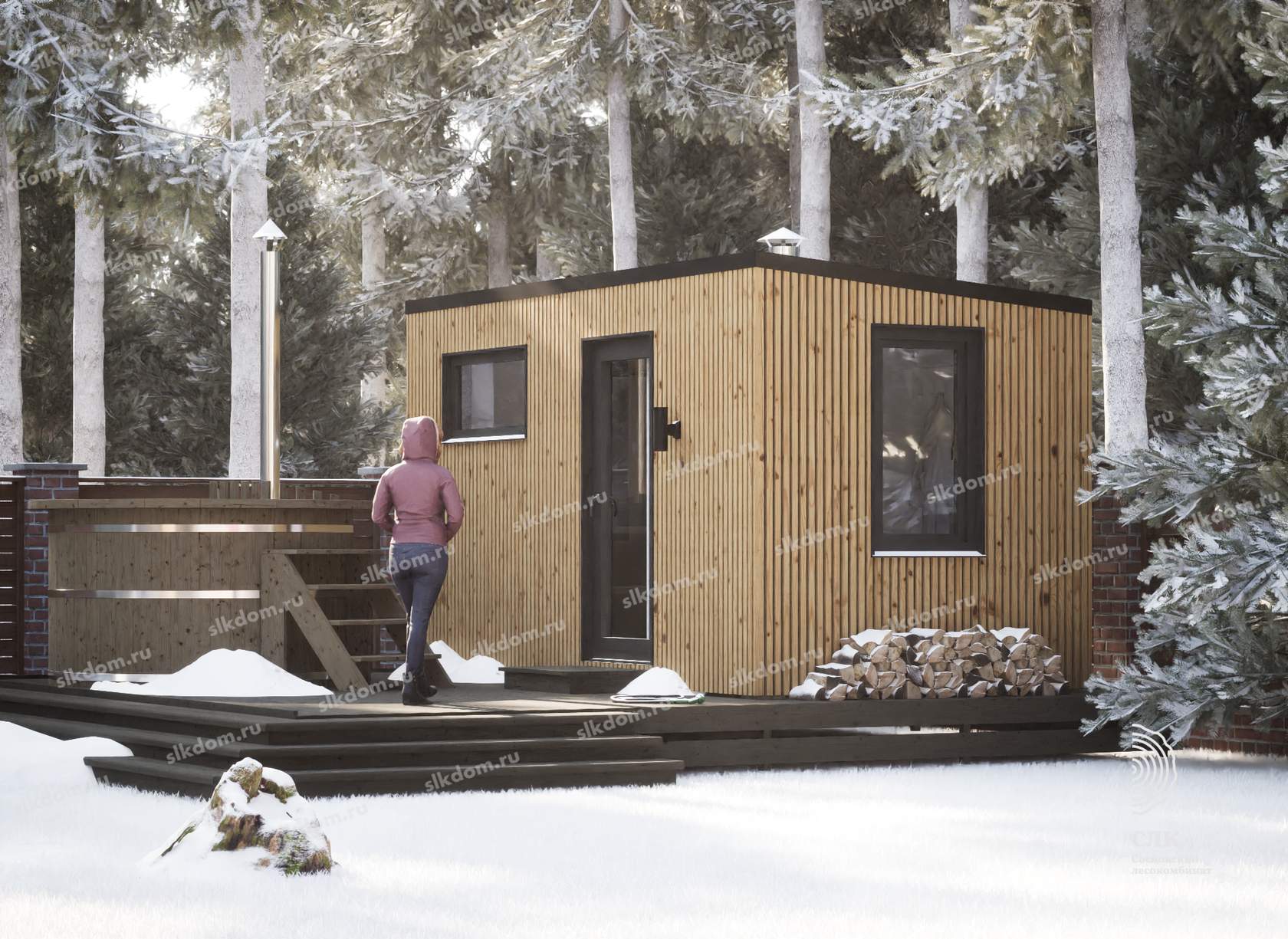 Покрытие корпуса бани - два слоя лессирующей краски с антисептиком, цвета на выбор из каталога, есть доп. опция – заменить лессирующую краску на укрывного типа.