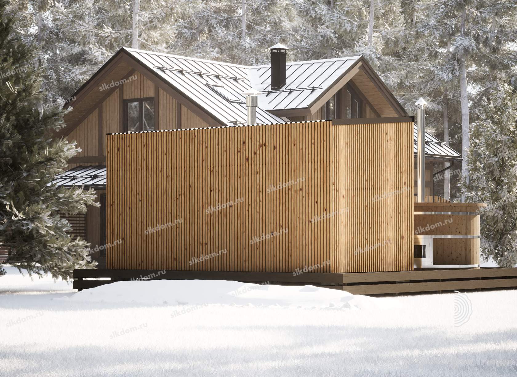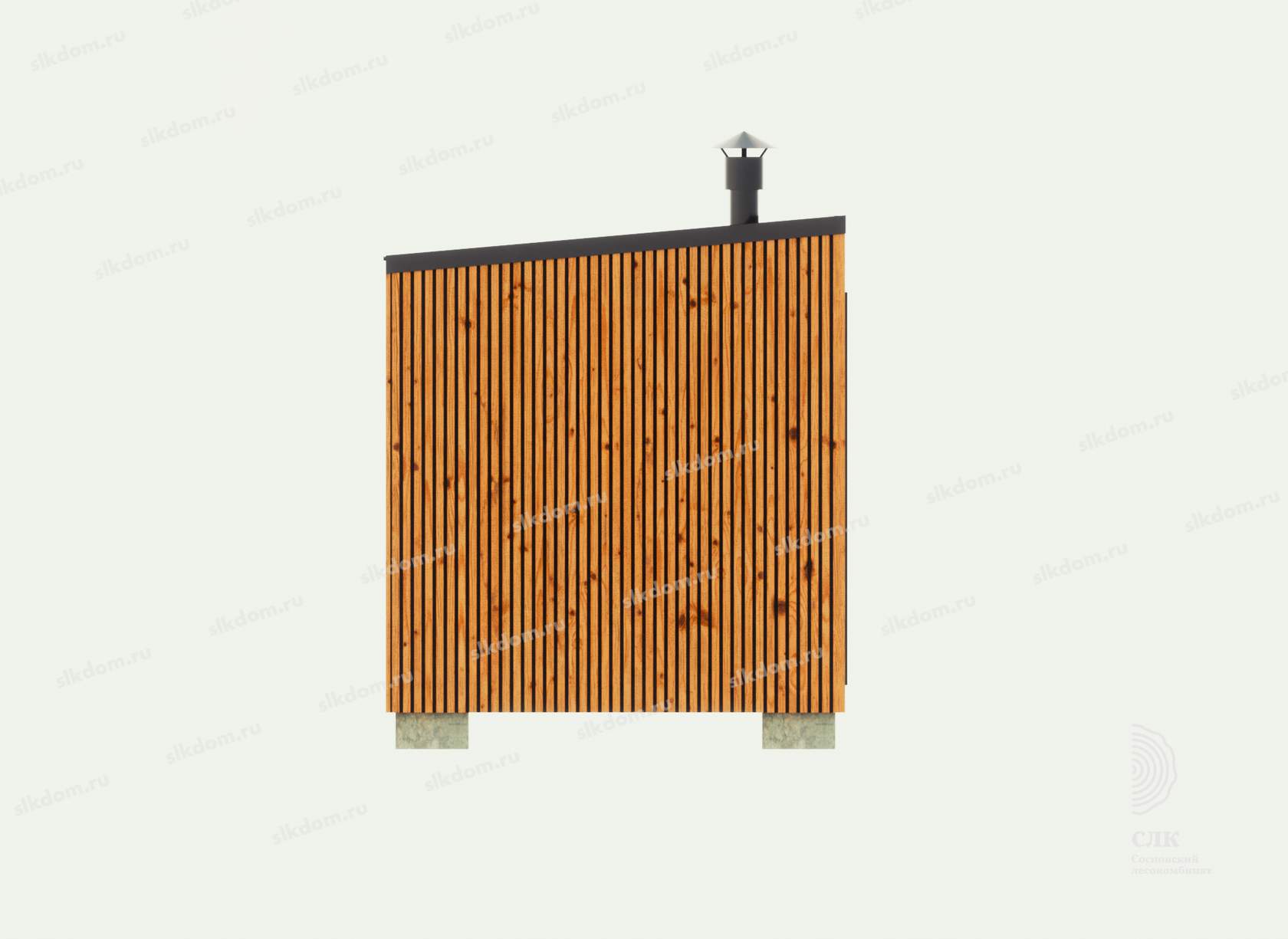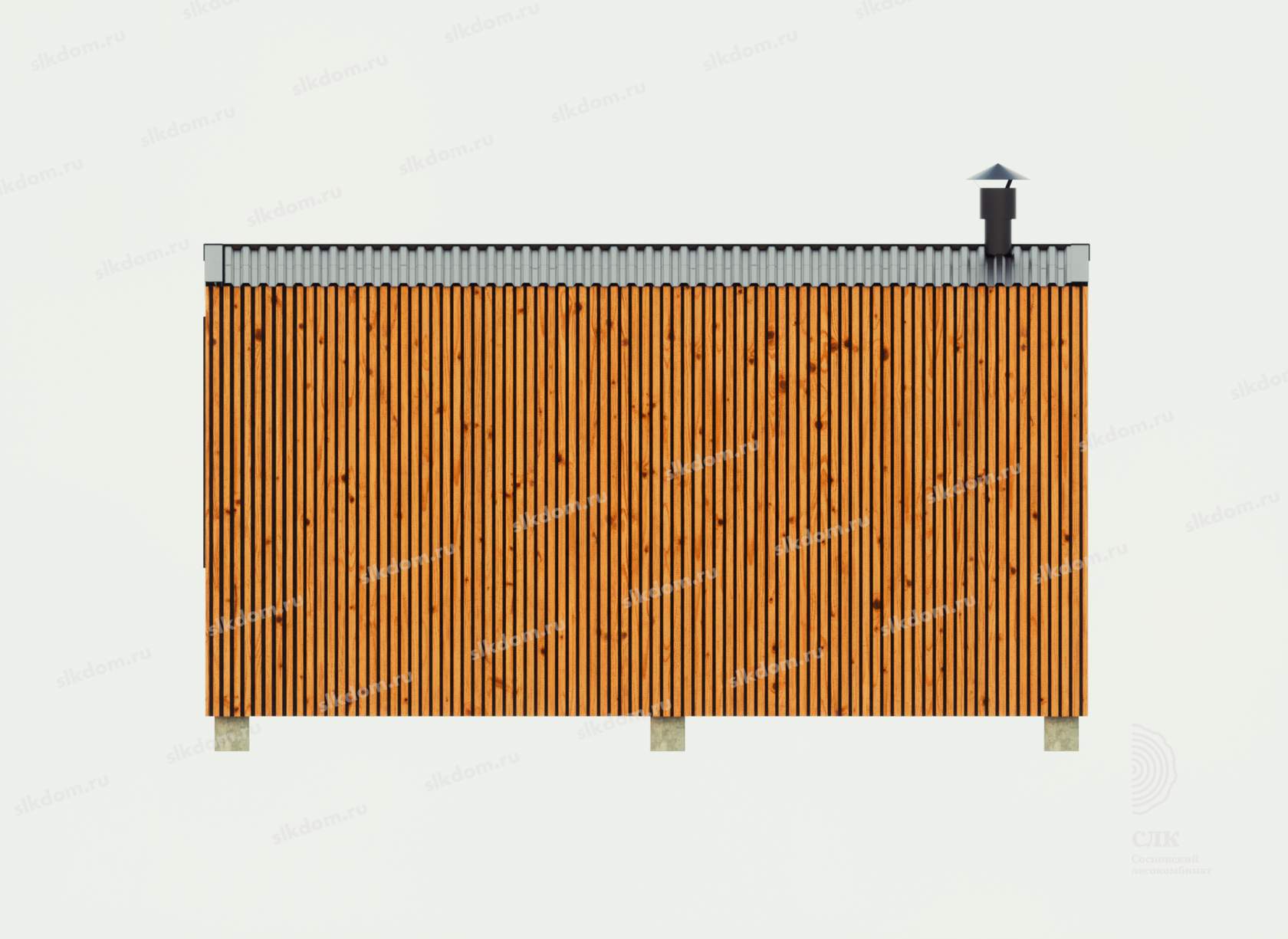 Поверх укладывается доска по длинной части кровли 100x25 мм с шагом 33 см, материал хвоя, ест. влажности. Покрытие кровли - профлист, размер листа 1200х2000 мм, толщина 0,45 мм, цвет на выбор - коричневый, серый, бордовый и зеленый. Покрытие кровли всегда можно заменить на другой материал, цены уточняйте. По краям кровли крепится торцевая планка из оцинкованного металла с полимерным покрытием.