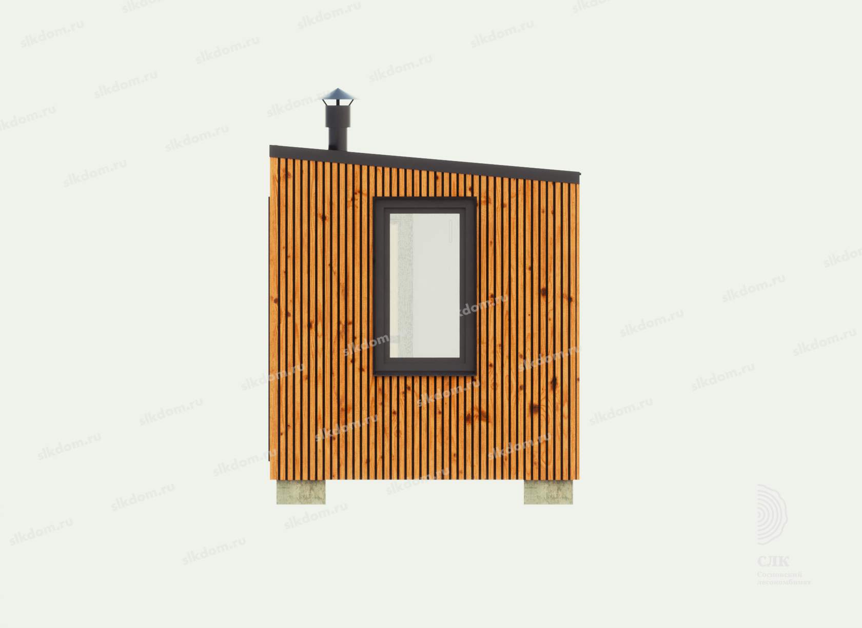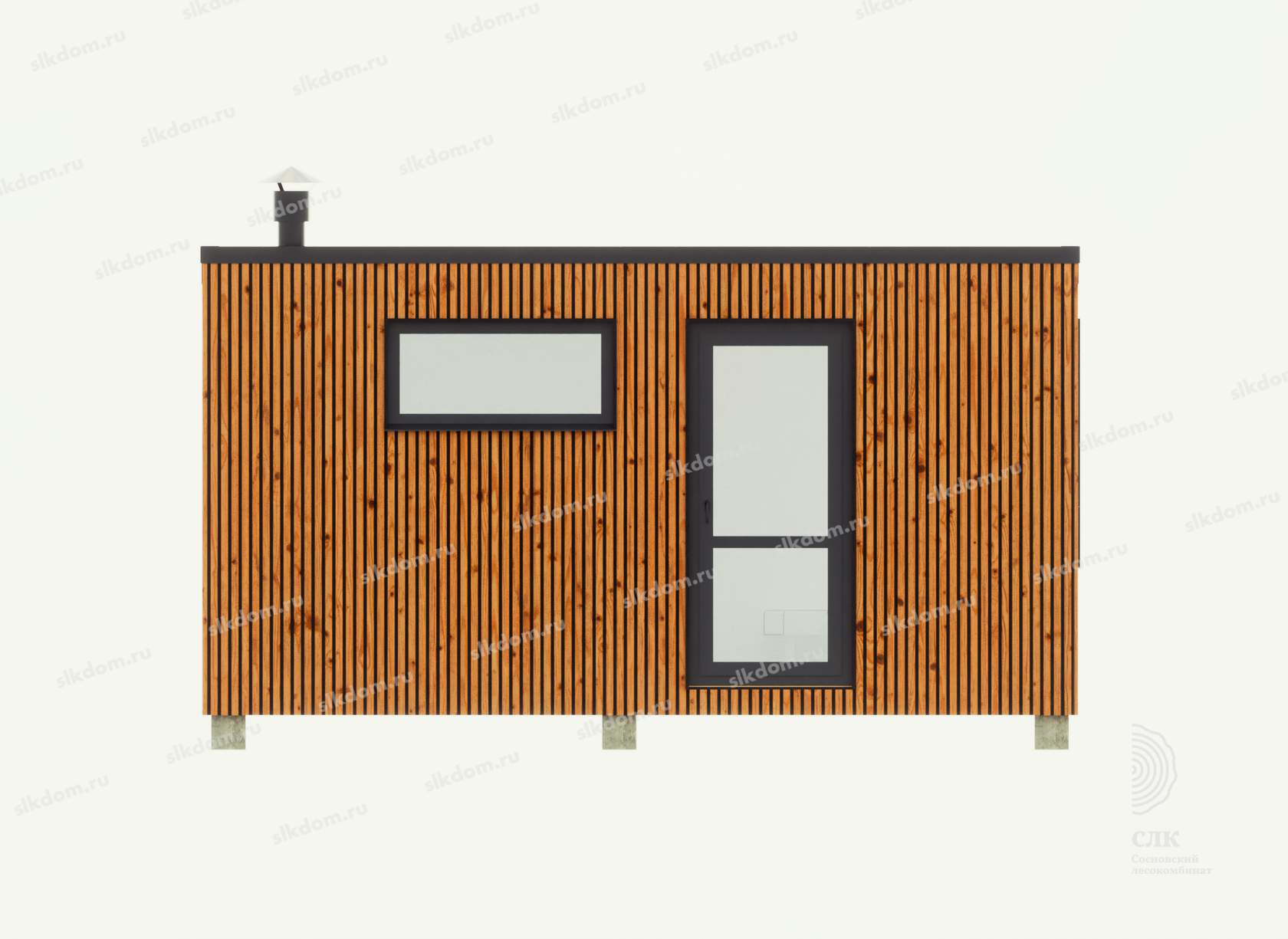 В комнате отдыха, в зависимости от длины бани окна ПВХ ламинированные с двойным стеклопакетом 800x1400 или 800x1600 (поворотно-откидные) и 1800x1600 мм для размера корпуса 7 метров в длину - глухое. Окна возможно добавлять и изменять размеры - уточняйте!