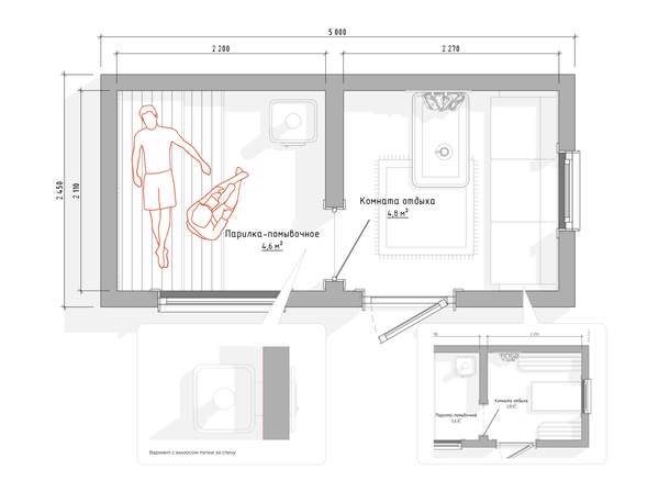 Печь дровяная Везувий с чугунной дверцей, изображена на фото, топка в базовой комплектации осуществляется из парного помещения (топку есть возможность вынести за стену - доп. опция, также печь можно заменить на любую другую, даже электрическую). Защита от нагрева на полу и стене – плита огнезащитная Минерит, толщина 1 см. Камни печные Габбро-диабаз 40 кг для верхней загрузки печи (общая вместимость печи 120 кг, укладываются по бокам, есть возможность заказать под полную загрузку).
