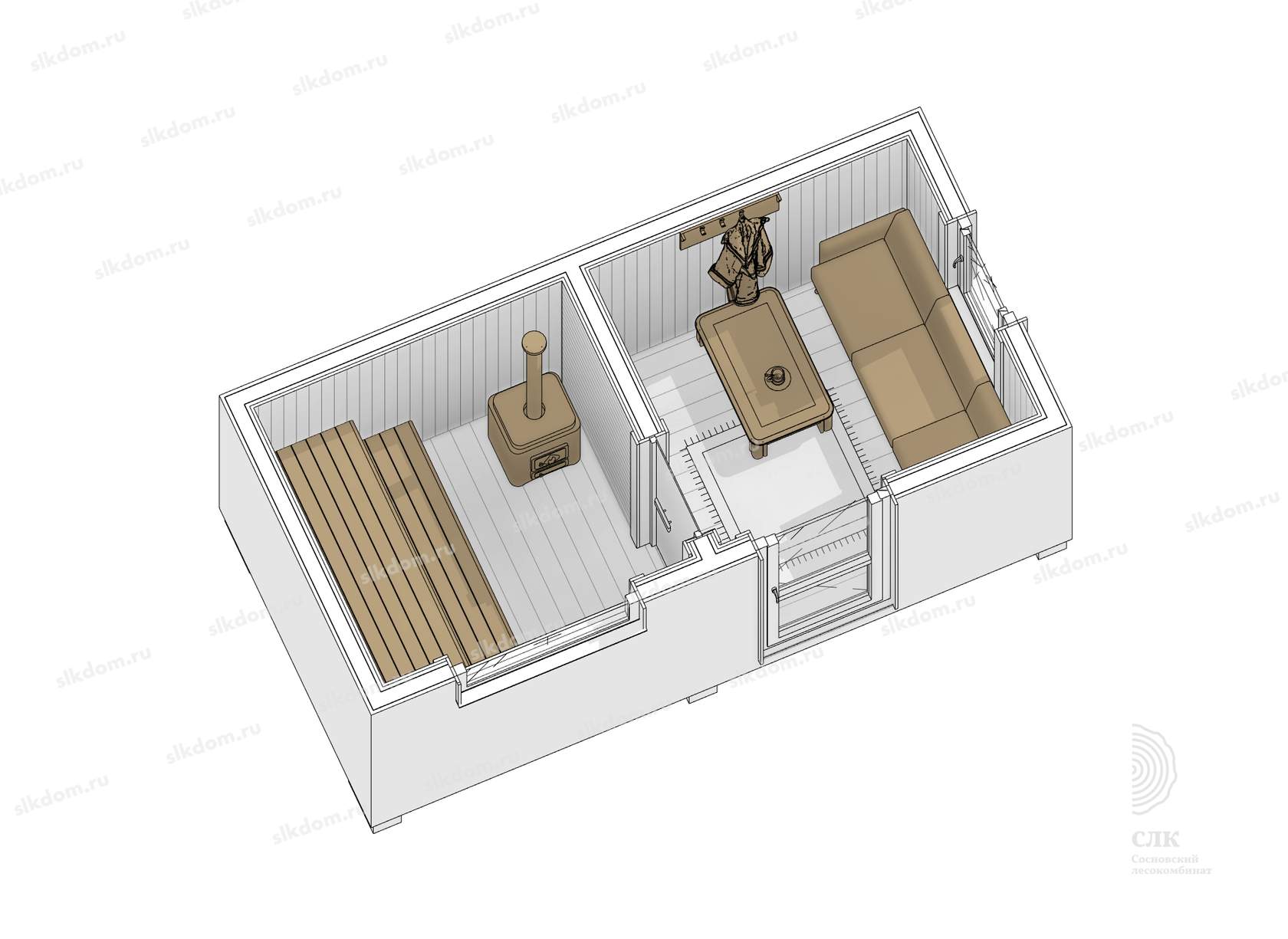 Комфортное размещение от трех до четырех человек. Сделано по каркасной технологии: в стенах, кровле и в полу 100 мм утеплителя. Комплектация бани - готовая к применению после установки на участке.