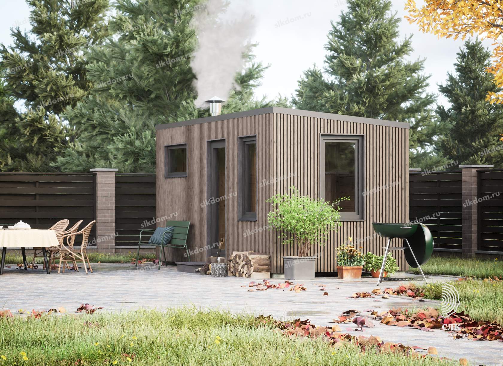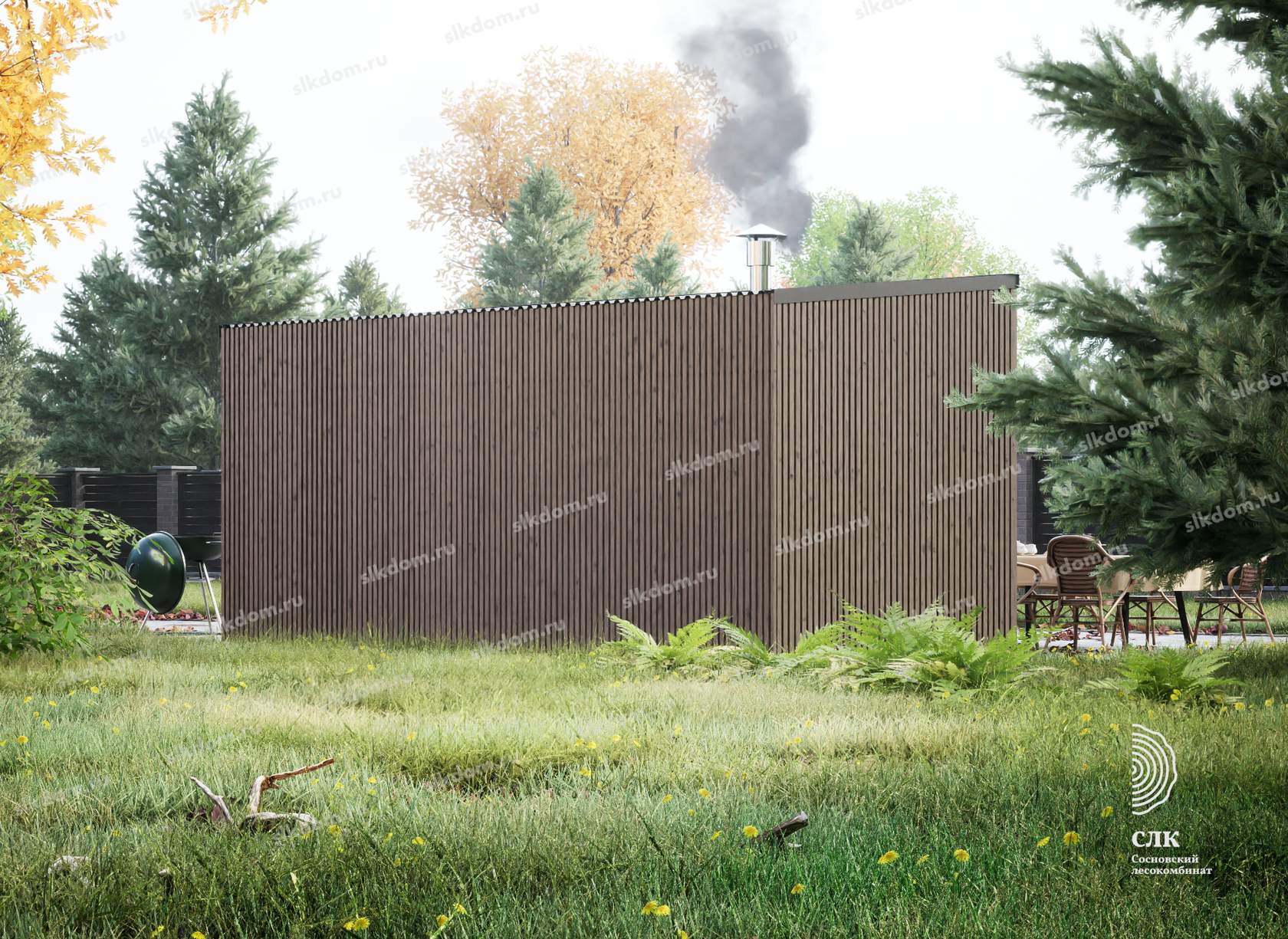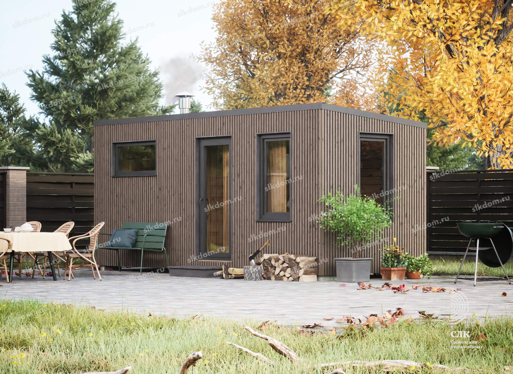 Покрытие корпуса бани - два слоя лессирующей краски с антисептиком, цвета на выбор из каталога, есть доп. опция – заменить лессирующую краску на укрывного типа.