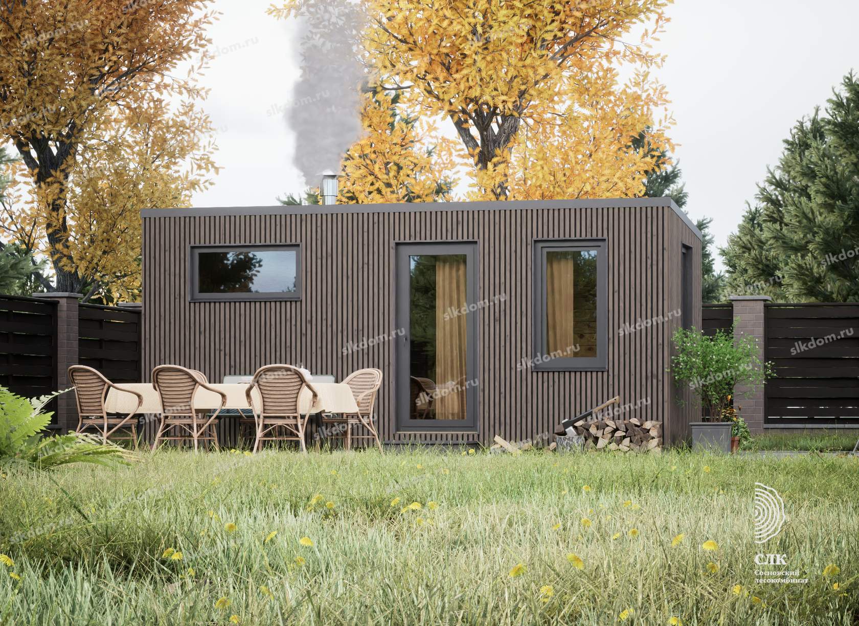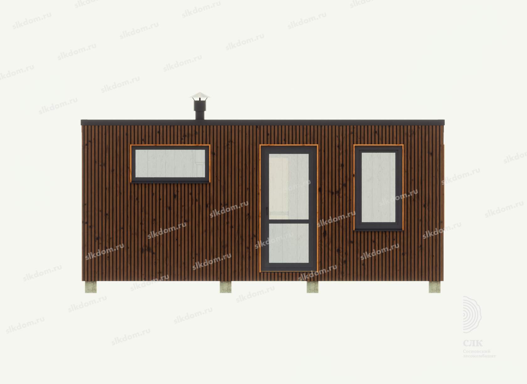 В комнате отдыха, в зависимости от длины бани окна ПВХ ламинированные с двойным стеклопакетом 800x1400 или 800x1600 (поворотно-откидные) и 1800x1600 мм для размера корпуса 7 метров в длину - глухое. Окна возможно добавлять и изменять размеры - уточняйте!