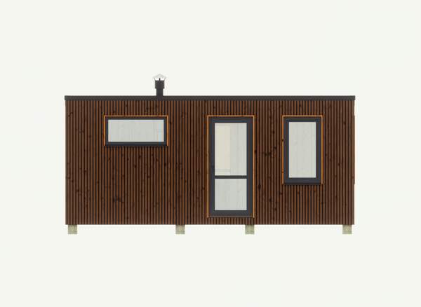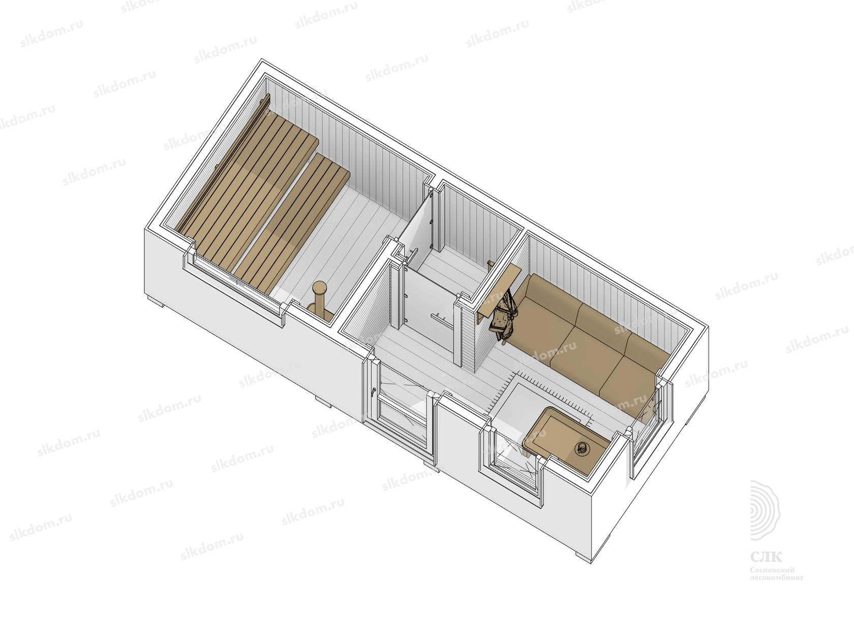 Комфортное размещение от трех до четырех человек. Сделано по каркасной технологии: в стенах, кровле и в полу 100 мм утеплителя. Комплектация бани - готовая к применению после установки на участке.
