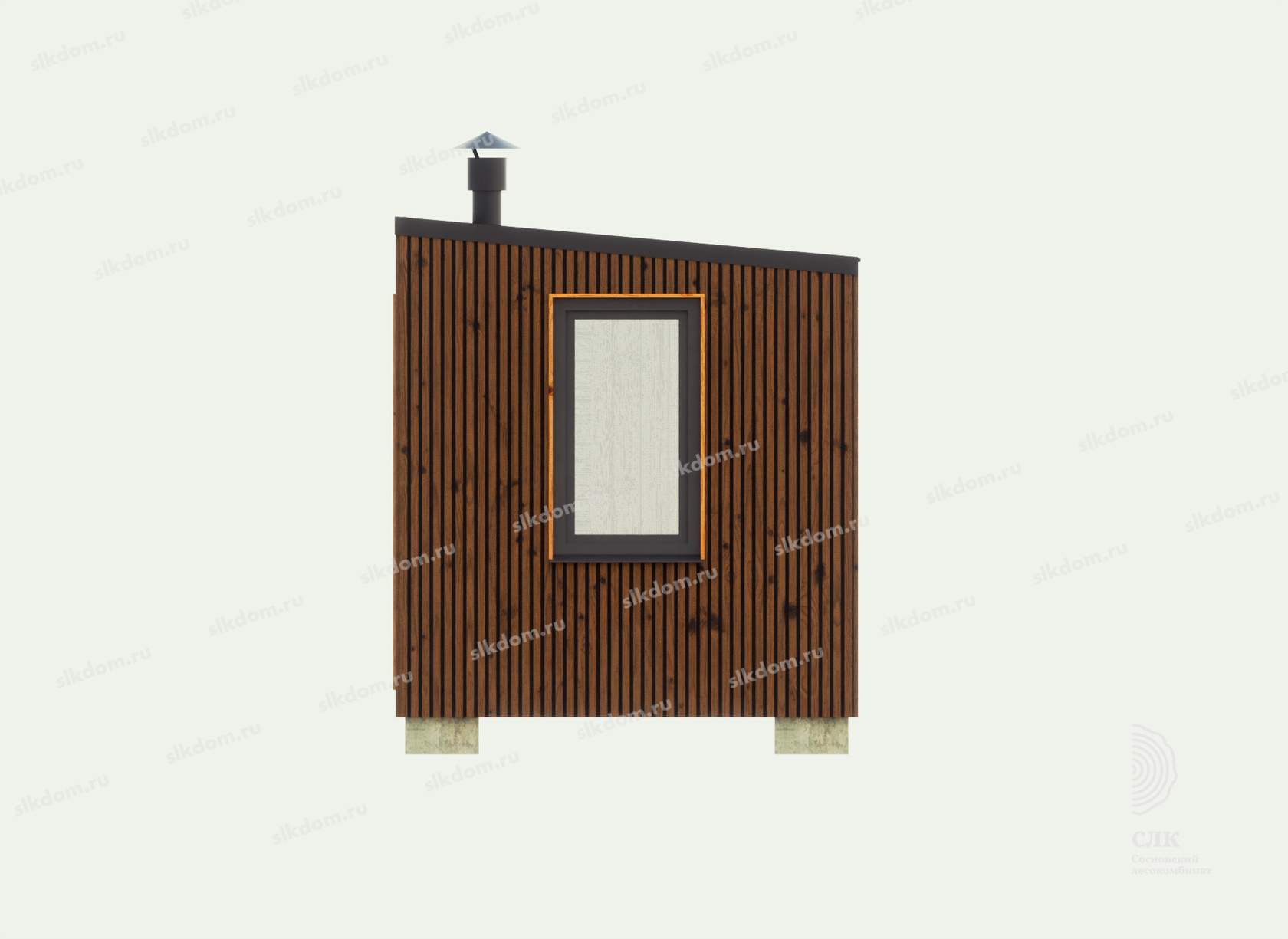 В парном помещении в базовой комплектации устанавливается деревянное окно 1000x500 мм с двойным стеклопакетом, внешнее стекло может имеет зеркальную поверхность (доп. опция), окно открывается на проветривание. В случае с баней Корунд длиной 350 см, устанавливается входная группа размером 2100x1800 мм, тонированная с ламинацией.