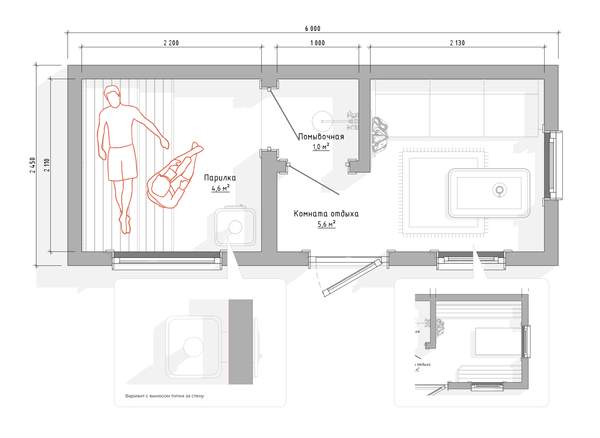Печь дровяная Везувий с чугунной дверцей, изображена на фото, топка в базовой комплектации осуществляется из парного помещения (топку есть возможность вынести за стену - доп. опция, также печь можно заменить на любую другую, даже электрическую). Защита от нагрева на полу и стене – плита огнезащитная Минерит, толщина 1 см. Камни печные Габбро-диабаз 40 кг для верхней загрузки печи (общая вместимость печи 120 кг, укладываются по бокам, есть возможность заказать под полную загрузку).